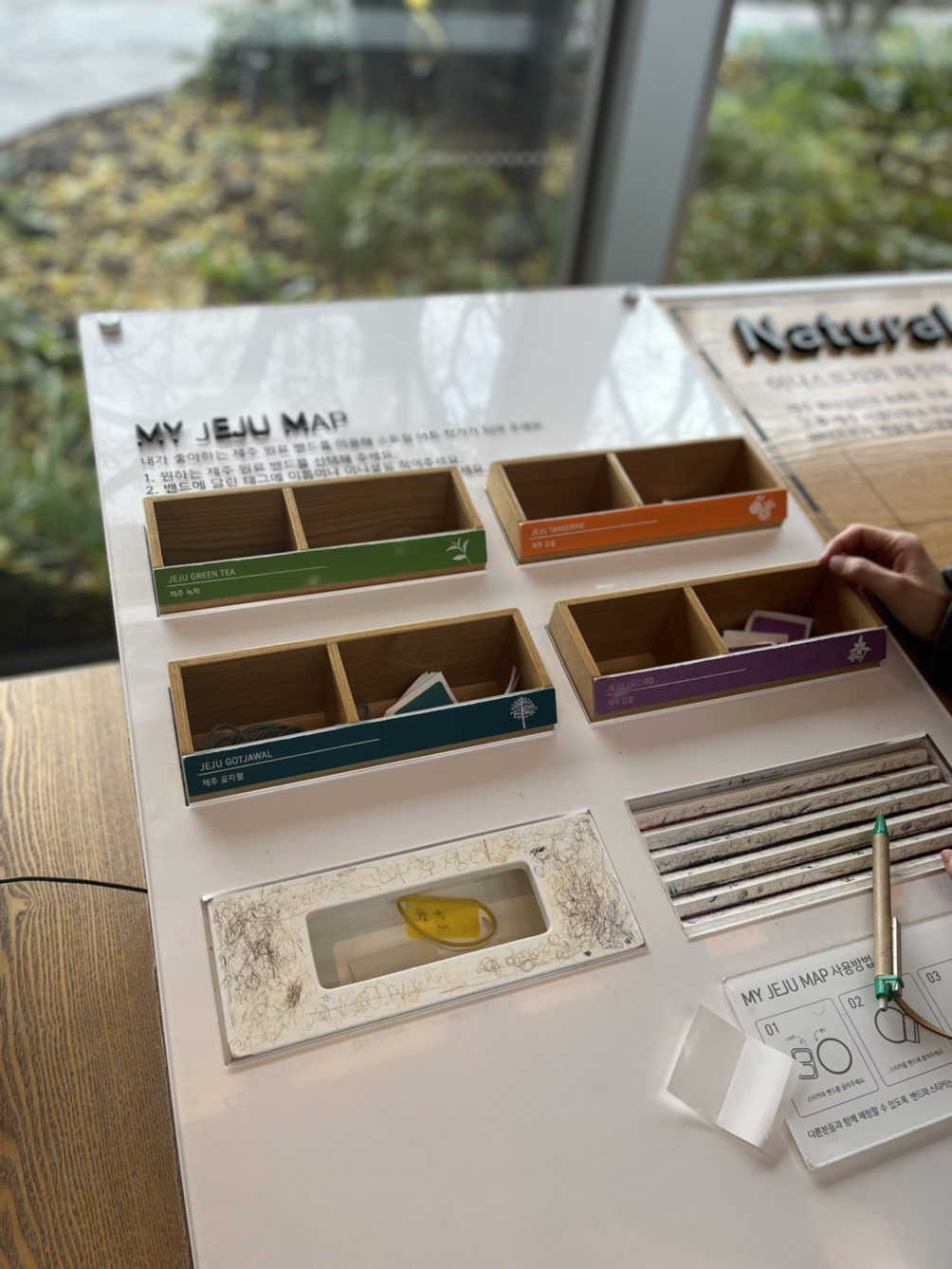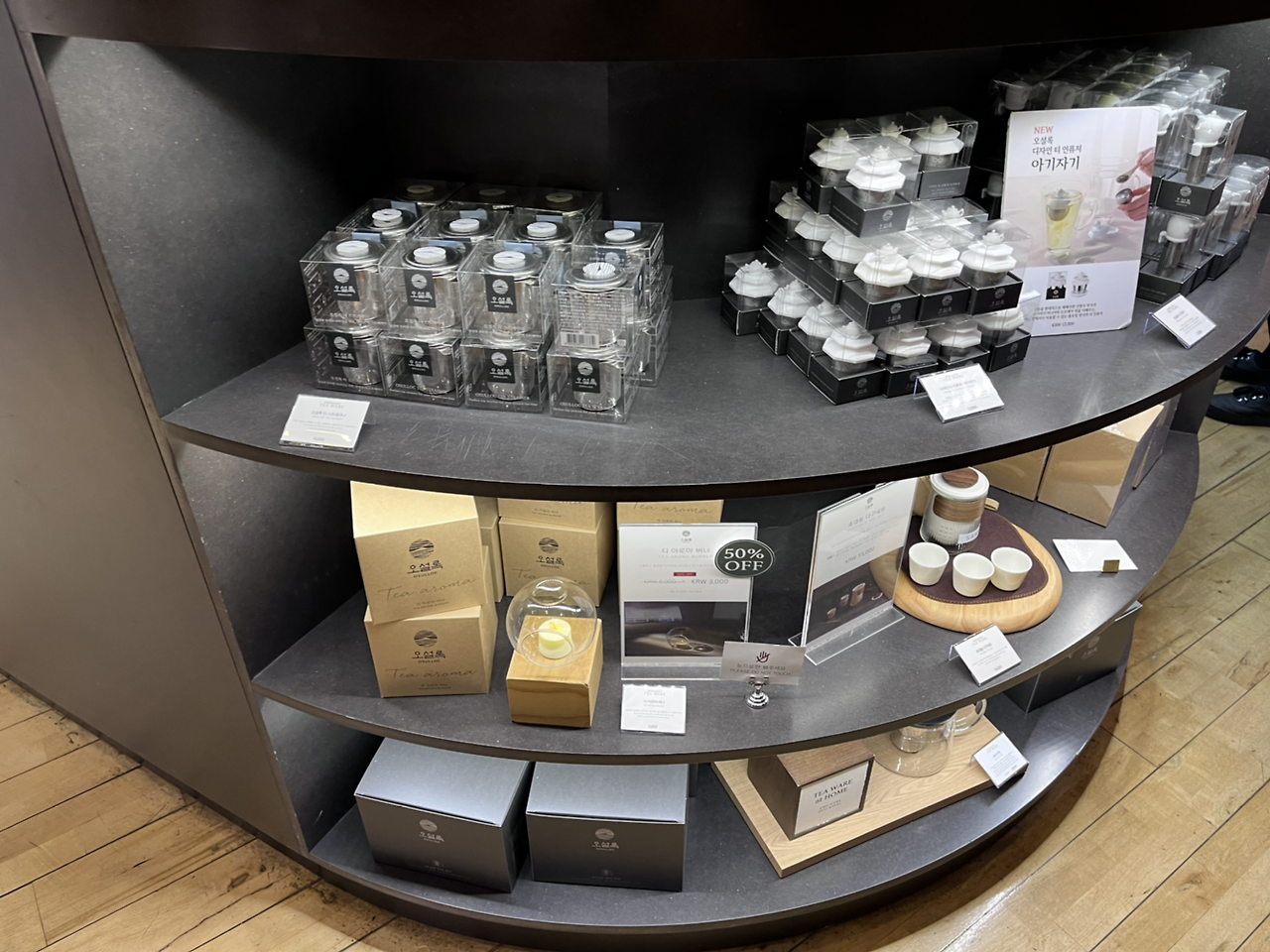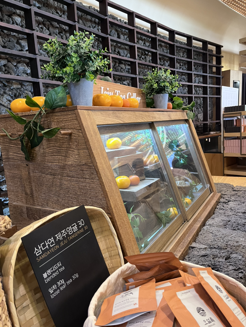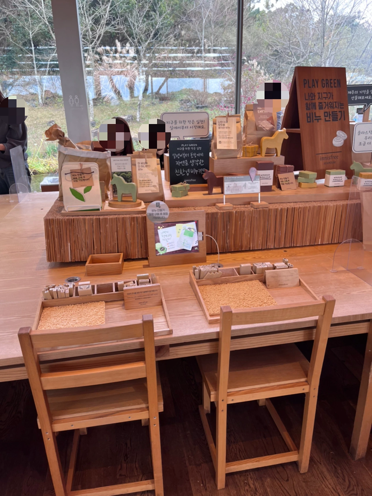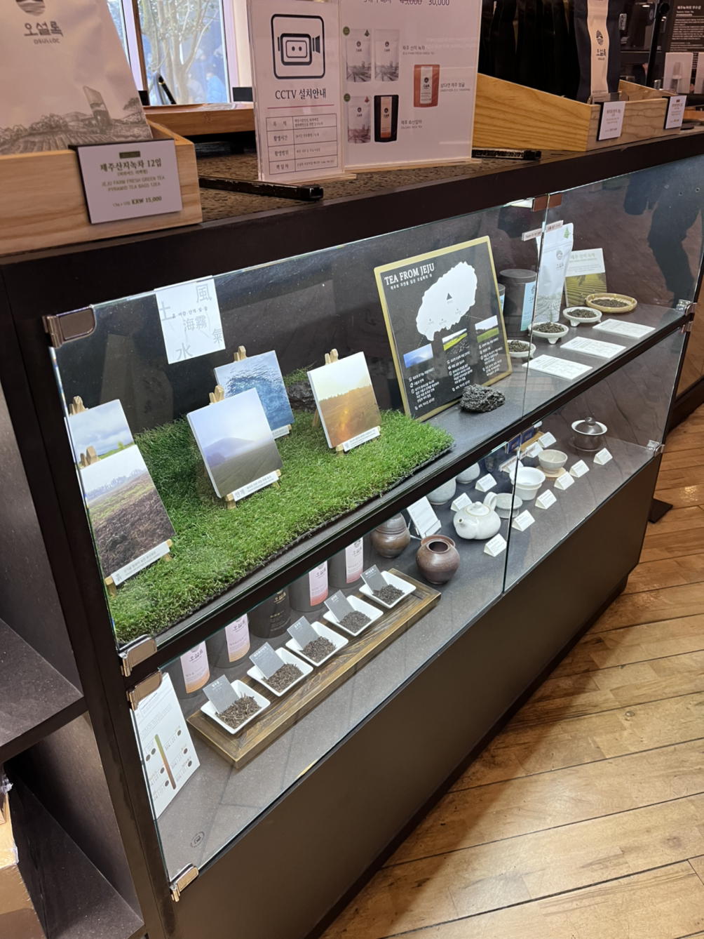 카페 옆의 판매대에선 다양한 제주산 재료로 만든 이니스프리 제품을 보기 좋게 전시하여 홍보하고 있다.