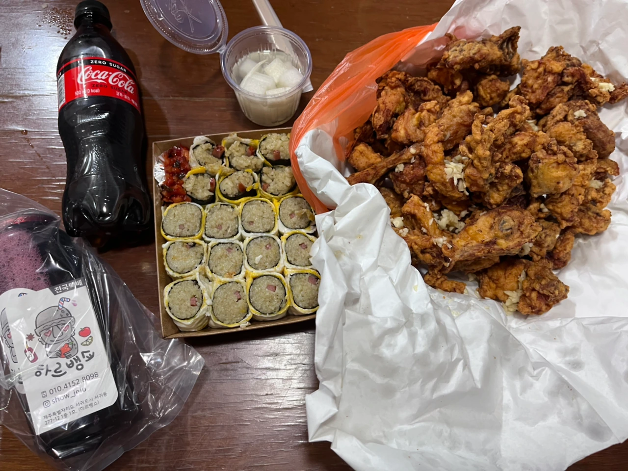 : 먹방파티. 치킨은 다 못 먹고 남았다.