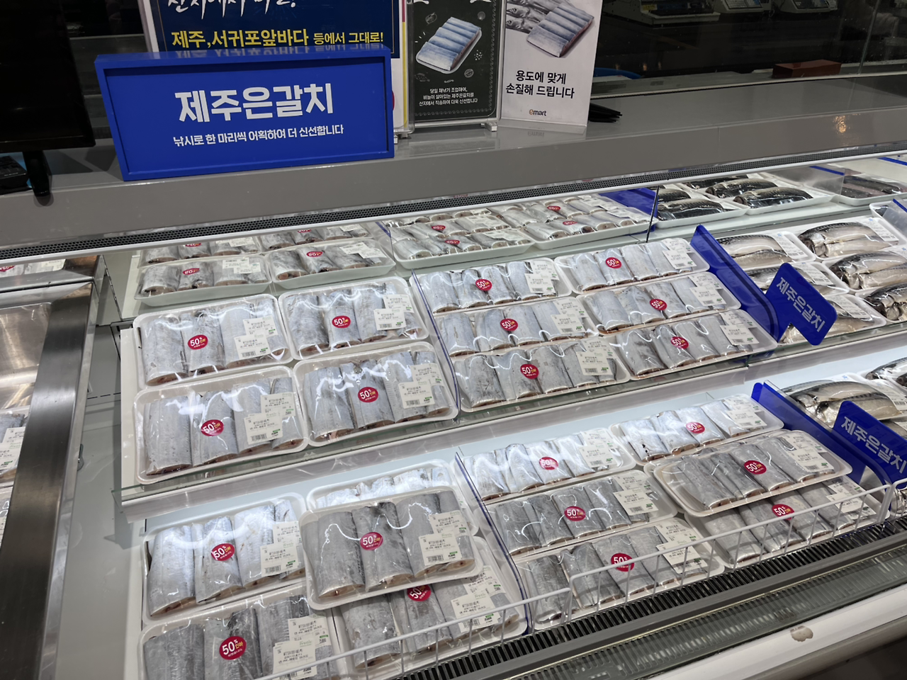 맛있는 빵도 들고 이마트의 잘 진열된 상품들을 보다 보니 기분이 하이해졌다. 게다가 이마트 안에 제주 흑돼지 코너와 제주 갈치 코너가 있고 반값 할인도 하는 걸 보니 기분이 더더욱 하이해져버렸다!