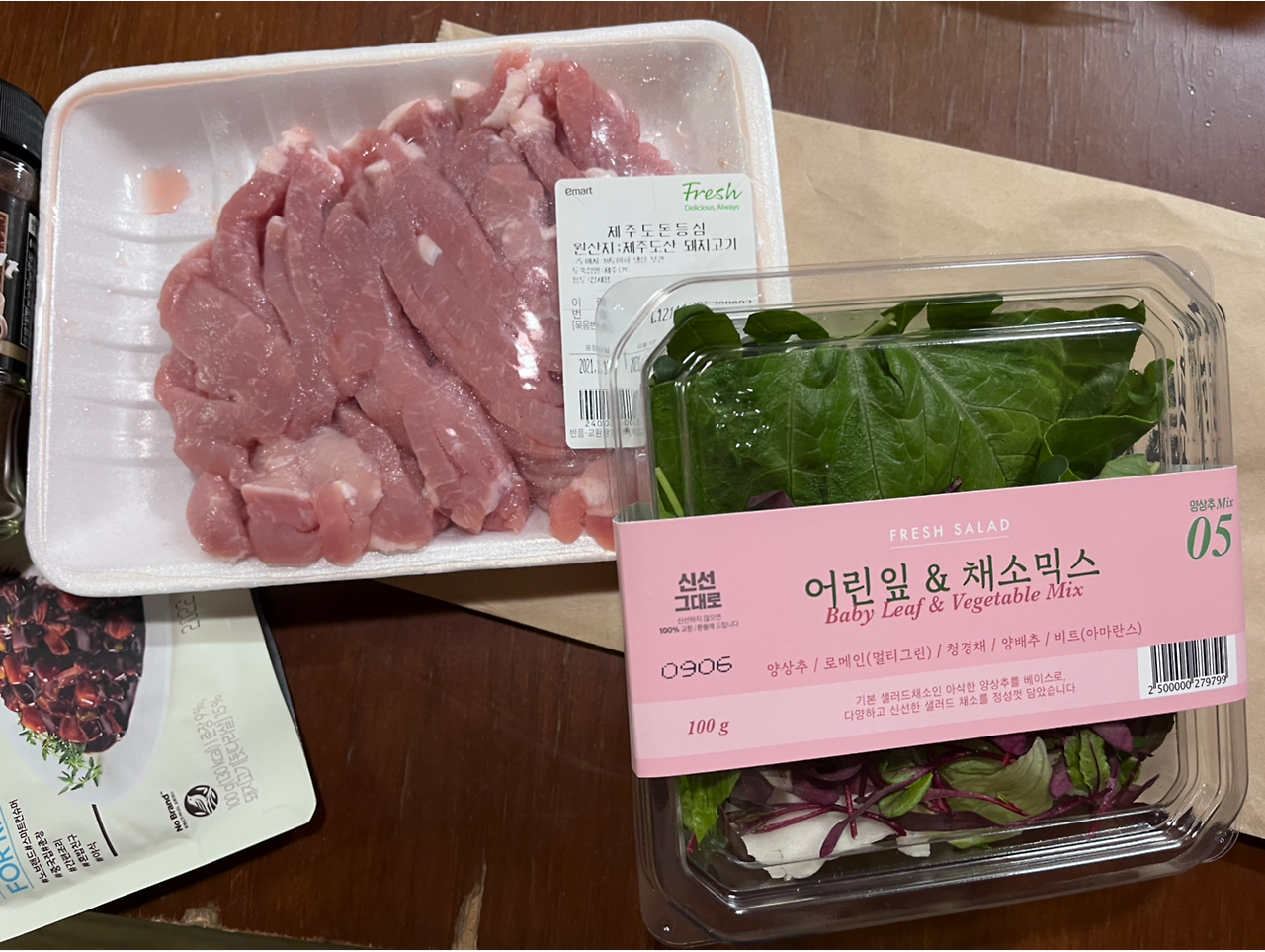 구워 먹을거리가 특별히 많진 않아서 일단 돼지 안심살에 혹시 냄새가 난다면 같이 먹을, 혹은 맛있더라도 나중에 밥에 같이 먹을만한 자장소스 그리고 샐러드 거리 + 빵과 먹을 인스턴트 헤이즐넛향 커피를 사서( 드립백을 살까 하다가 헤이즐넛 향을 맡으면 너무 즐거울 거 같아서 향을 즐기기 위해 헤이즐넛을 픽) 나왔더니 기운이 솟아오른다. 시스터 필드 종이백에 야무지게 짐들을 챙겨서 걸어 나오니 너무나도 행복해졌다.