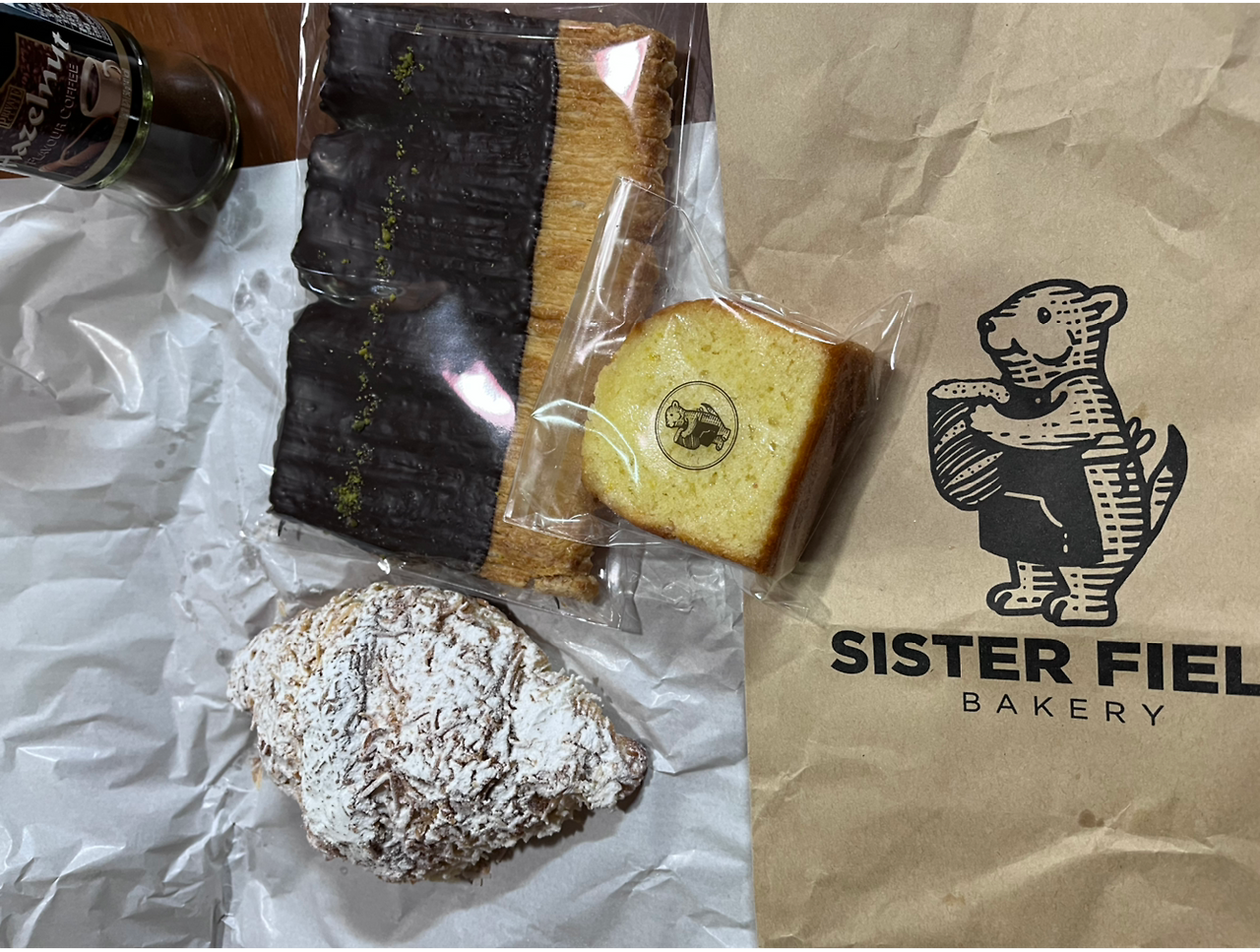 그 건물 1층엔 이전에 J가 추천해줬던 시스터필드 빵집도 있으니까 빵집에서 저녁거리+ 커피를 사 가려고 생각을 했다. 이전에 드립백 1회분씩 포장된 걸 팔았던 기억이 나서. 아 역시 그 빵집 빵은 뭔가 나머지 자주 갔던 두 군데보다 훨씬 반짝거린다. 위치가 좀 더 일부러 가야 하는 곳이라 안 갔는데 오늘은 전에 갔던 빵집보다 더 맛있어 보이는 필마까레도 있어서 이전에 탐내던 바삭해 보이는 코코넛 카야 크루아상과 레몬 파운드케이크 1회 분과 함께 구매했다.