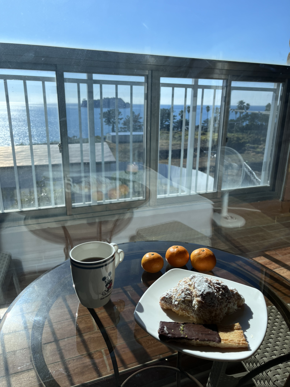 어제 사온 빵과 헤이즐넛 커피를 우걱우걱 먹고 다른 지역 숙소들을 구경하며 빈둥대다가 12시 반쯤 너무너무 졸려서 오늘도 몹시 좋은 서귀포의 바다 반사빛을 피해 침대 옆 구석에서 3시 반까지 계속 잠을 잤다.