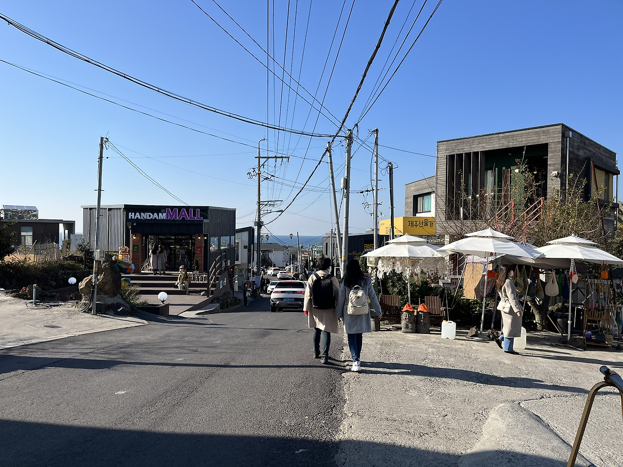 카페가 있는 이쪽 지역은 버스로 두 정거장 정도면 오던데. 내리자마자 그동안의 제주와 약간 다른 분위기로 젊은 연령의 사람들이 엄청 많이 있었다. 기념품 샵들도 많고. 물론 들어가 보니 그동안의 기념품샵과 있던 물건들이 비슷해서 그냥 대충 보고 다시 카페거리 쪽으로 왔지만. 어디에도 사람들이 상당히 많았다.