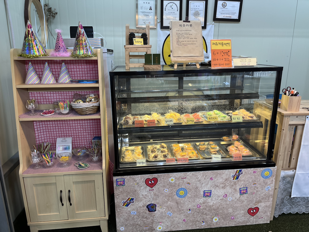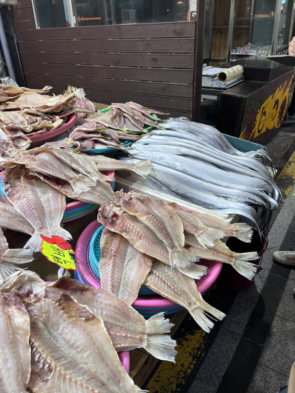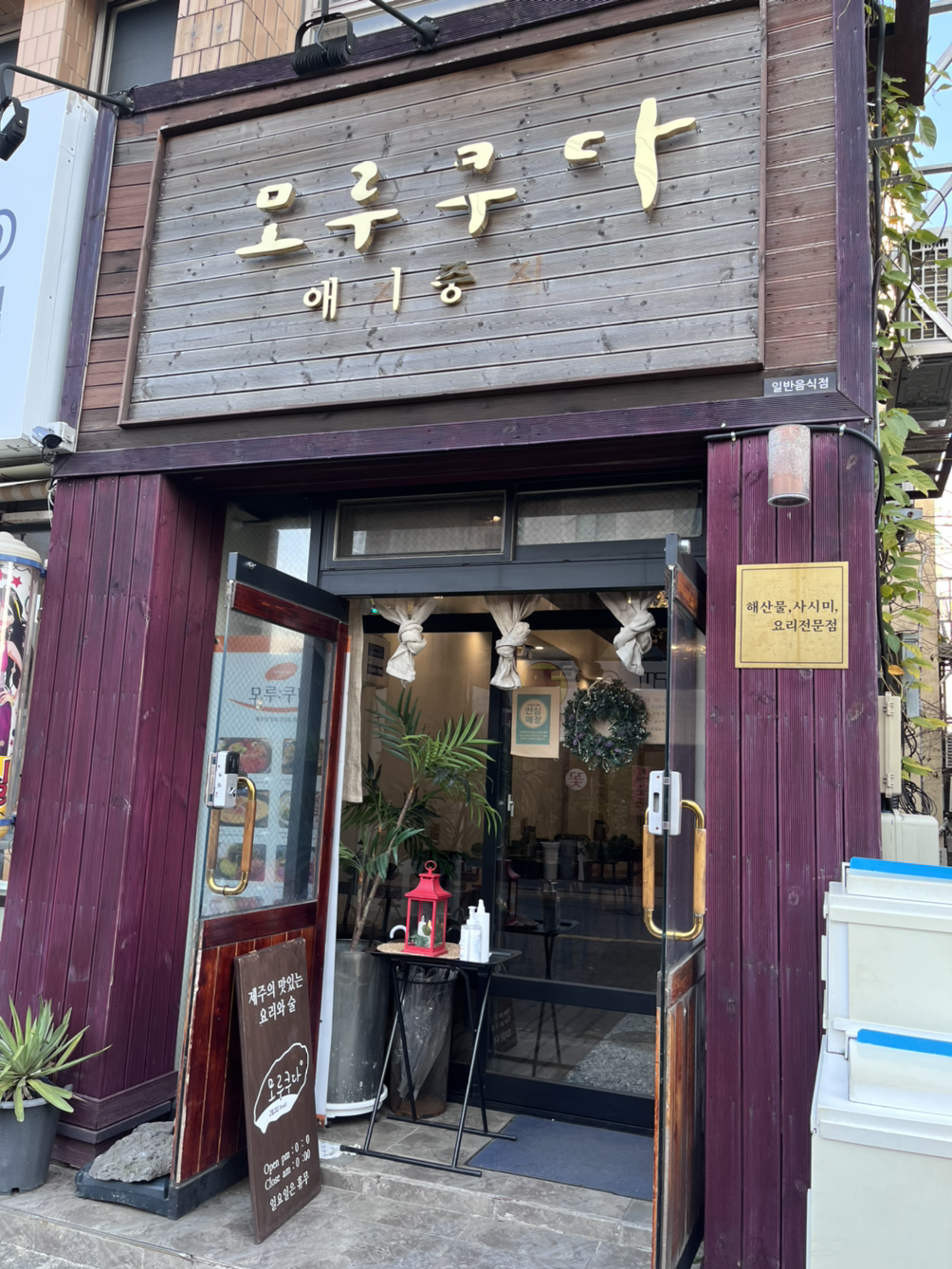 눈이 또 휘둥그레 해지고 각종 귤들과 무슨 레드향이 아니고 처음 보는 붉은 귤( 홍매향이라고 한다 사진을 보니)도 있어서 그걸 엄빠께 보내드리고 싶다는 생각이 강하게 들었다. 갈치도 시장 한 구석에 있었는데 바로 보내기엔 좀 망설여지는 비주얼이었다. 제주 카롱 같은 집도 있고 아기자기한 기념품 집들도 근근이 있어서 눈이 즐겁고 재밌었다. 제주돼지 김치말이 등등 시장 메뉴들도! 다음 일정이 없으면 사가고 싶었는데 가방이 이미 너무 무거워서 좀 버리고 싶은 느낌이라 확 사기가 망설여졌다. (내일은 가방 좀 훨씬 가볍게 들고 나와야지. 타로카드를 빼거나 해야 할 듯. 탭이랑 키보드 다 빼고 글을 그냥 숙소에 가서 정리하거나 ㅠㅠ 진심 너무 무거워. 다닐 때 기운이 1.5배로 떨어지는 느낌이야. 내일은 학원에 갔다가 둘레길을 제대로 갈 생각이니까 더더욱 그래야겠다.) 그렇게 구경을 하다 보니 거의 3시 58분이 되어 음식점에 들어갔다. 홍매향은 나중에 먹어보고 사기로 마음먹고.