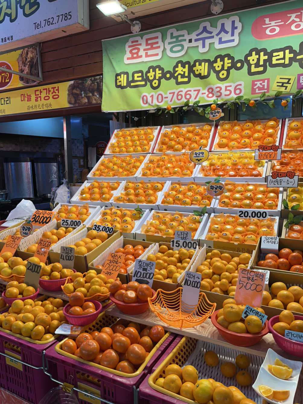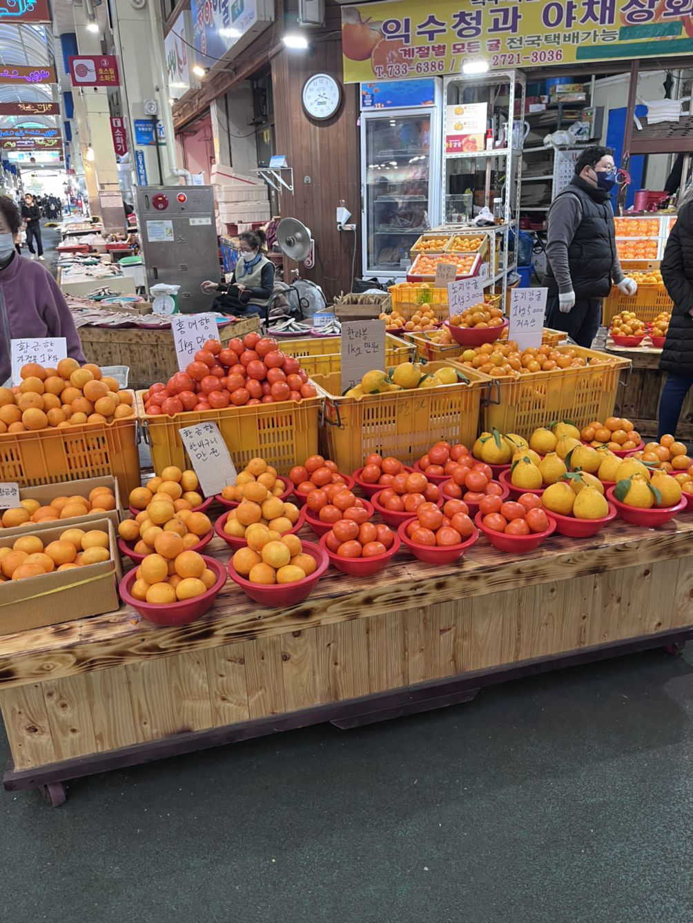 밥을 먹었더니 또 기운이 불끈 나서 시장에 가서 일단 집에 시키기 전에 홍매향이 맛있는지 먹어보고 사러 갔다. 머리에 귀여운 두건을 하신 귀여운 아주머니분이 계신 가게에 섞어 귤이라는(ㅋㅋ) 딱 내 취향의 종류별로 먹어볼 수 있는 귤이 있어서 그걸 샀다. 보통 1킬로에 다 만원이던데 섞어 귤은 홍매향과 황매향 그리고 그냥 귤 종류별로 다 있는데 같은 가격이라 한 200프로의 매력이 있고 너무 귀여웠다. 봉지에 귤을 담아 배송료는 +5000원이라는 정보를 듣고 먹어본 후 다시 가게로 오기로 마음먹었다.