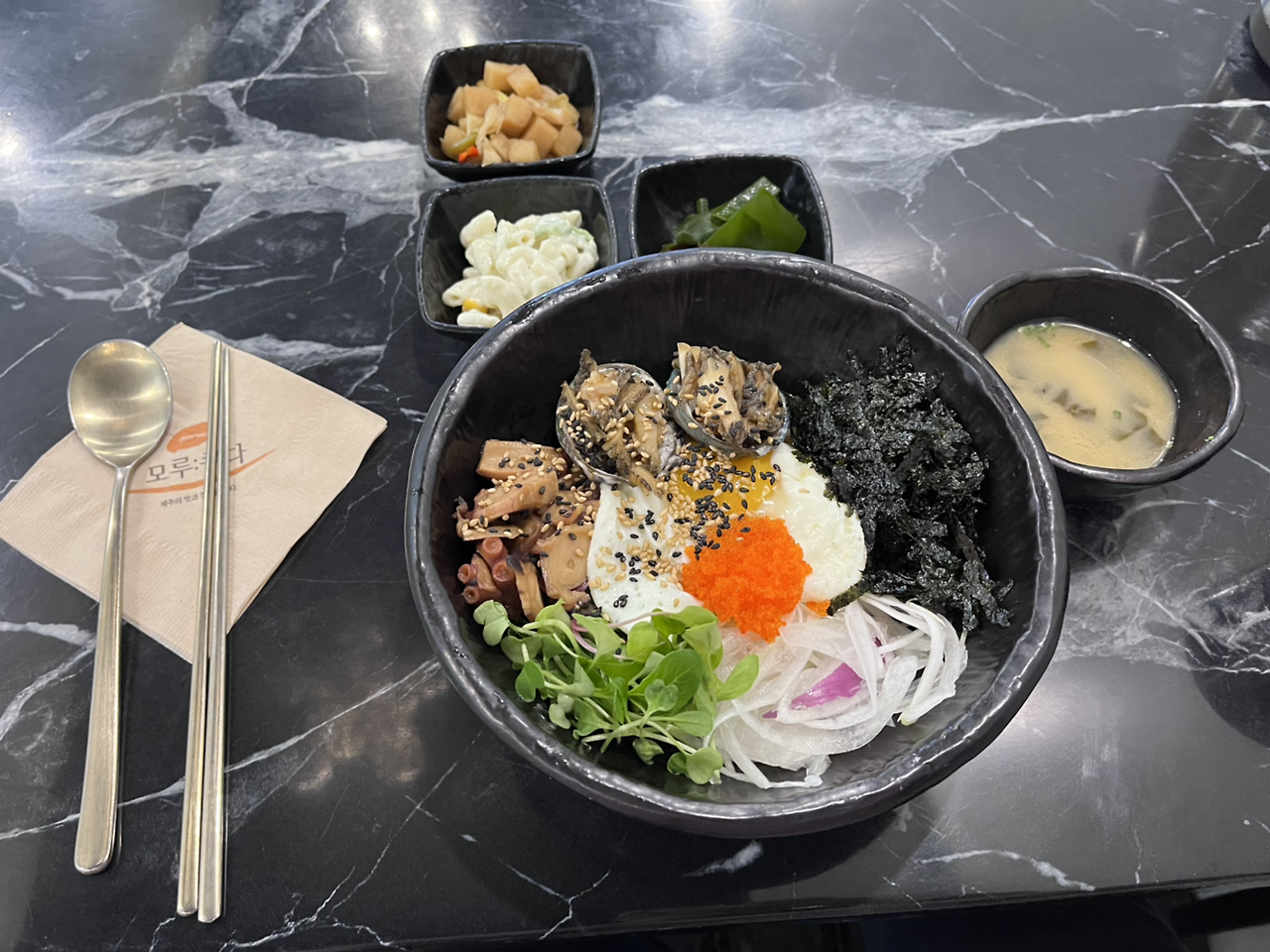 혼자 여행 오신 분들이 많이 오시는지 이번엔 젊은 종업원분이 친절하게 대해주셔서 자리에 앉아 편히 메뉴를 시켰다. 나름 전복과 문어가 들어간 메뉴인데 가게도 세련됐는데 어제 갈칫국과 거의 비슷한 금액이라 만족하며. 라면 같은 밀가루 메뉴가 아닌 영양밥이니 메뉴를 시키면서도 만족감이 들었다. 종업원 분이 손을 약간 떨면서 주셔서 국이 세 방울 떨어졌지만 뭔가 정감 가는 분이셨다. 그리고 아이폰이 20프로 대라 걱정이 되었는데 알아서 충전도 잘해주셨다. 밑반찬도 맛있고 ( 바질 마카로니 같은 메뉴 + 미역 초장은 건강해지려고 그냥 먹었다.) 간도 딱 적당하니 장도 비린내 안 나고 좋아서 싹싹 다 긁어먹었다. 다 먹을 즈음 다른 혼자 여행 오신 듯한 여자분도 오셔서 라면을 시키셨다. 여기 라면엔 황게가 들어간다는데 그걸 먹어봤여야 했나 싶었지만. 밀가루가 안 먹고 싶었다. 에너지 부족은 밥을 먹어줘야 한다는 옛날 사람.