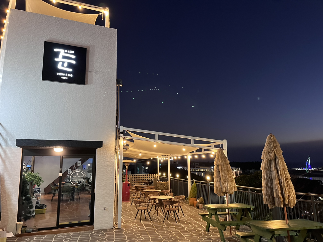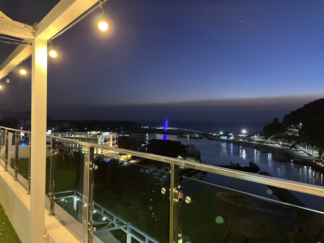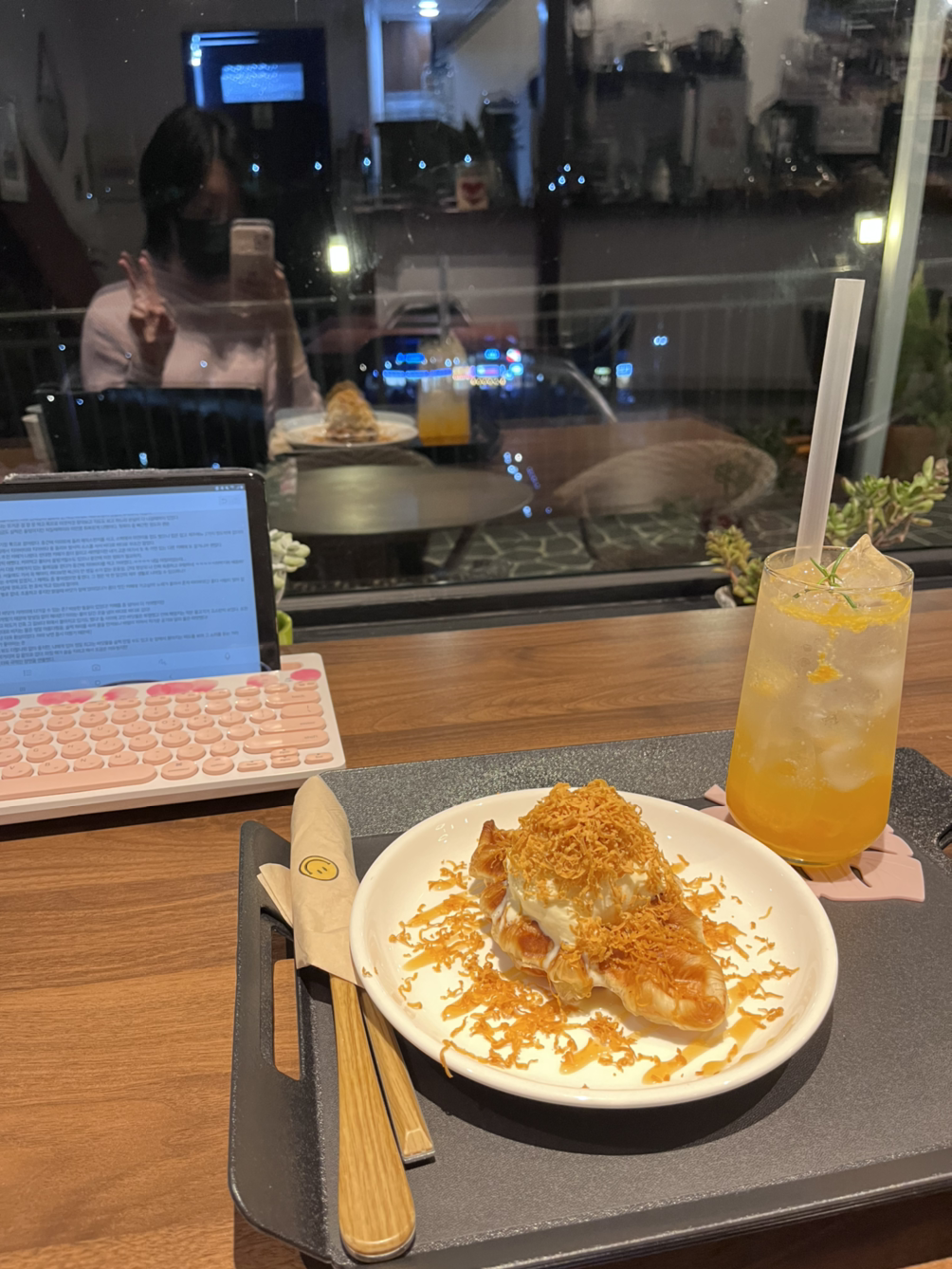멀리로 불빛이 켜진 다리도 보이고 전구들도 이쁘고. 브라운치즈크로플이 이전에 서울에서 소개받은 곳보다도 맛있어서 우걱우걱 순식간에 먹고