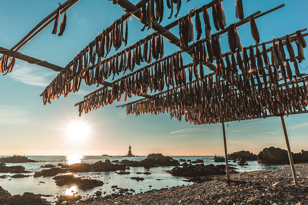 날씨가 쌀쌀해지면 떠오르는 과메기. 차가워진 공기와 바닷바람, 강한 햇살이 만들어낸 과메기는 경북 포항이 본산이다. 호미곶에서 구룡포해수욕장 사이에는 과메기 덕장이 즐비하다. 품질 좋은 과메기는 영하 10℃에서 영상 10℃ 사이 찬 바람에 건조해야 하는데, 포항 구룡포는 최적의 조건을 갖췄다. 잘 말린 과메기를 묵은 김치나 제철 미역에 싸 먹으면 쫀득한 맛이 일품이다.
