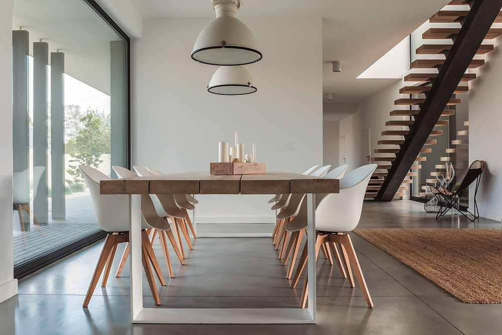 식탁을 비추는 조명은 상황에 따라 화려하고 밝은 분위기를 연출할 수 있도록 조광 스위치를 활용하는 것이 정석이다. 1~3대 정도의 펜던트를 식탁 크기에 맞춰 설치하거나 다운라이트, 스포트라이트로 천장에서 식탁을 비추는 방법이 있다.
