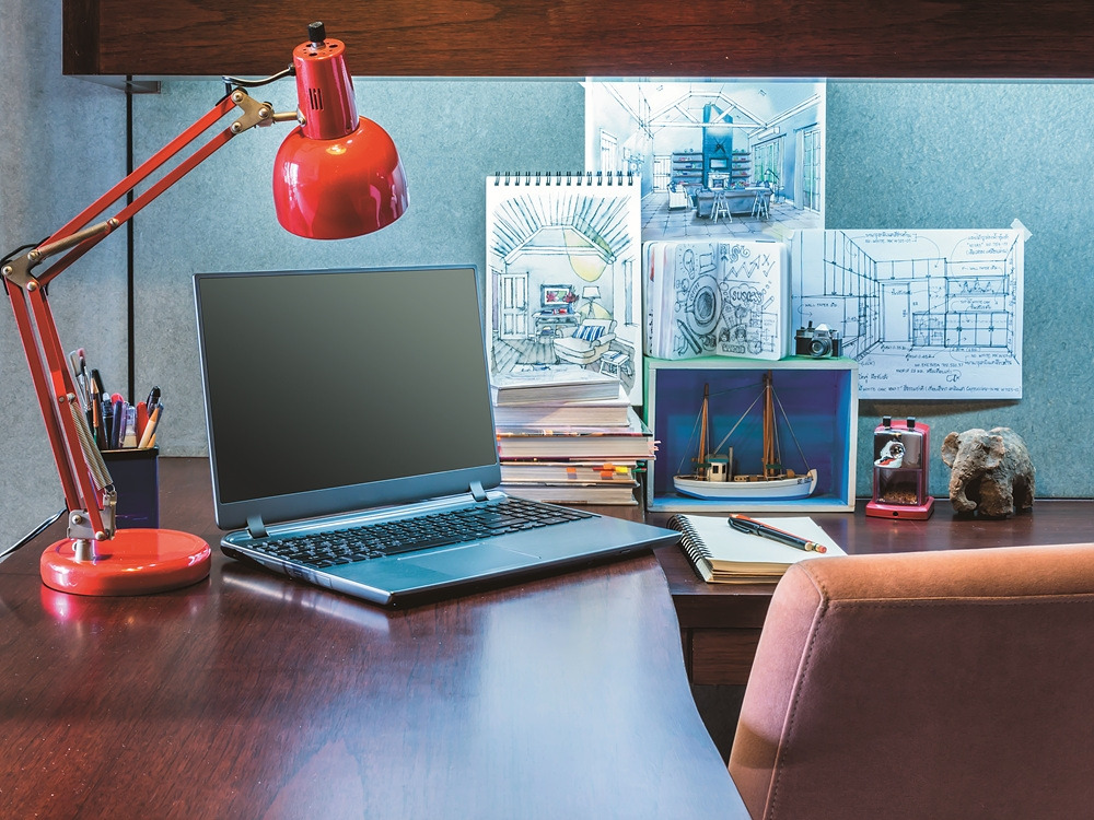 서재는 집 안 구조상 북쪽에 위치한 경우가 많다. 따라서 자연광이 잘 들어오지 않으므로 조명으로 안정적이고 차분한 분위기를 만들어야 한다. 천장에는 전반조명, 책상에는 국부조명을 설치하는 등 두 가지 조명을 활용하는 것이 좋다. 국부조명의 경우 램프가 시야에 들어오지 않게 해야 하고 책상 위에 스탠드를 놓는 것도 방법이다. 컴퓨터를 사용할 때 전반조명과 국부조명의 광원이 모니터에 반사될 수 있으니 조명의 형태와 위치를 고려해 설치해야 한다. 램프는 눈에 피로감을 덜 주는 백색으로 할 것.