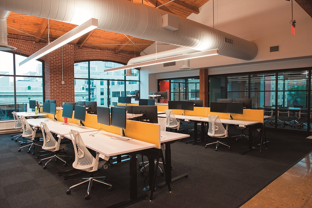 사무실은 작업과 휴식이 동시에 이루어지는 공간으로 업무 능률을 높일 수 있는 조명이 필요하다. 특히 빛에 의해 컴퓨터 모니터가 잘 보이지 않는 일이 없도록 천장에 매입하고, 루버 달린 조명 기구를 선택한다. 또 화면보다 주위가 어두우면 밝기 차이로 인해 눈의 피로가 가중되므로 조도를 올린다.
