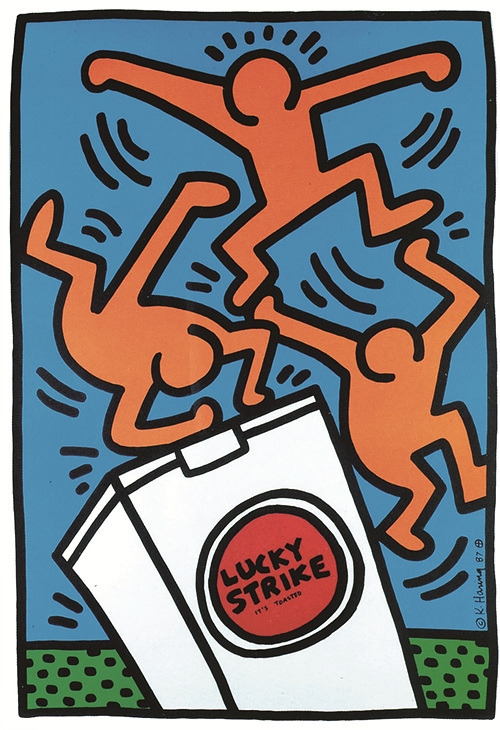 해링은 1987년 담배 브랜드 러키 스트라이크의 광고 등 다양한 광고에도 참가했다. 러키 스트라이크의 석판화 그림은 이 작품의 담뱃갑과 함께 고전적인 형상으로 나타난다. 그의 작품은 만화와 애니메이션을 좋아했던 어린 시절 취향과 작품 활동을 본격적으로 시작하던 당시 뉴욕 그라피티 화가들에게서 많은 영향을 받았다. 단순한 선과 강렬한 원색의 대비로 경쾌하고 유머러스한 분위기가 나는 것도 이 때문이다. 윤곽선만으로 단순화된 사람은 인종, 성, 연령이 드러나지 않은 보편화된 인간상을 나타낸다.