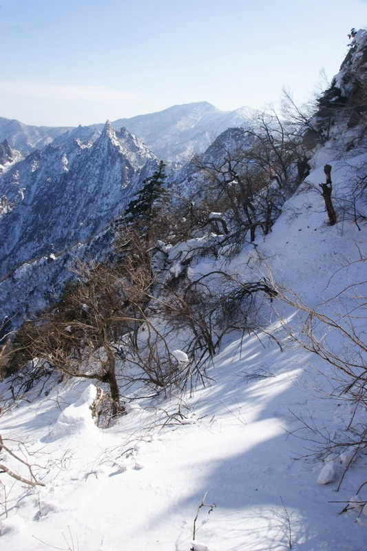 원래의 등산로를 한 번 넘겨다 보니 당연하지만 아무 흔적도 없이 그저 눈만 덮여 있었다. 더이상 그런 곳에서 헤매기는 싫었다. 우리도 발자국을 뒤쫓아 가파른 경사면을 내려가기 시작했다. 설악골로 향하는 것이었다.