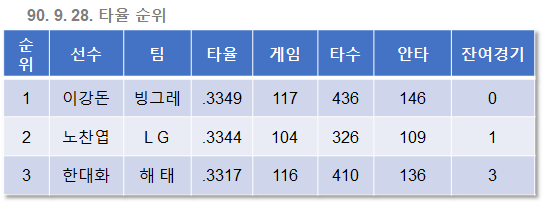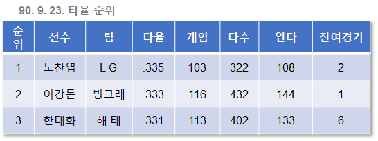 그리고 무엇보다 기쁜 소식. 이날 노찬엽은 4타석 2타수 1안타 1볼넷 1희생타를 기록했고, 빙그레 이강돈은 4타수 무안타를 기록했다. 두 경기를 남겨놓고 드디어 노찬엽이 대망의 타격 1위에 올라선 것이다.