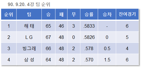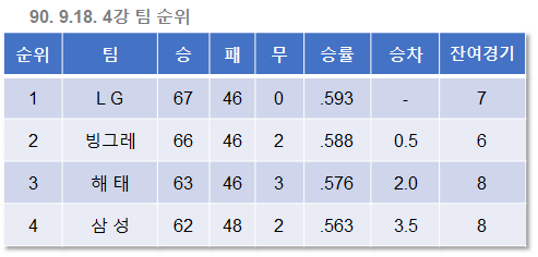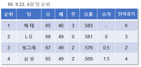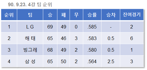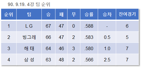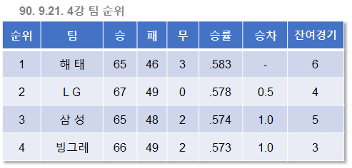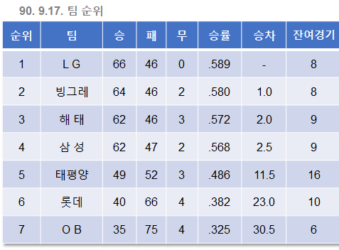 9월 16일. 앞서가던 빙그레가 해태에게 역전을 허용했다. LG와 빙그레의 승차는 이제 사라졌고, 승률에 뒤진 2위가 되었다.
