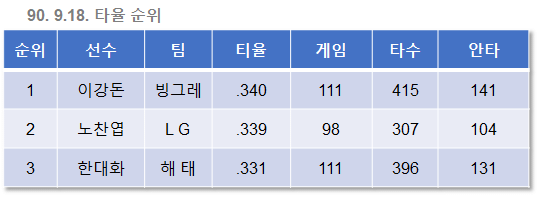 노찬엽도 3타수 1안타를 기록했지만 타율 .335로 이강돈의 .340과는 격차가 벌어지고 말았다.