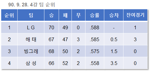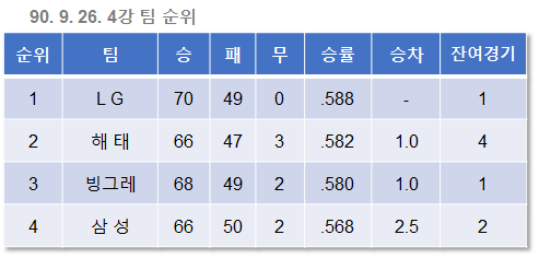 4강은 결정되었지만 1위와 4위의 차이는 불과 2.5게임. 4위나 3위는 포스트시즌에서 큰 차이가 없으니 되도록이면 2위를, 이왕이면 1위를 차지하려는 각 팀의 치열한 경쟁이 불을 뿜었다.
