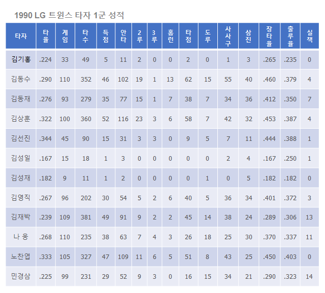 김동수 : 타율 11위 (.290), 홈런 10위 (13), 타점 7위 (62), 장타율 6위.460), 死구 3위 (10), 2루타 7위 (20)