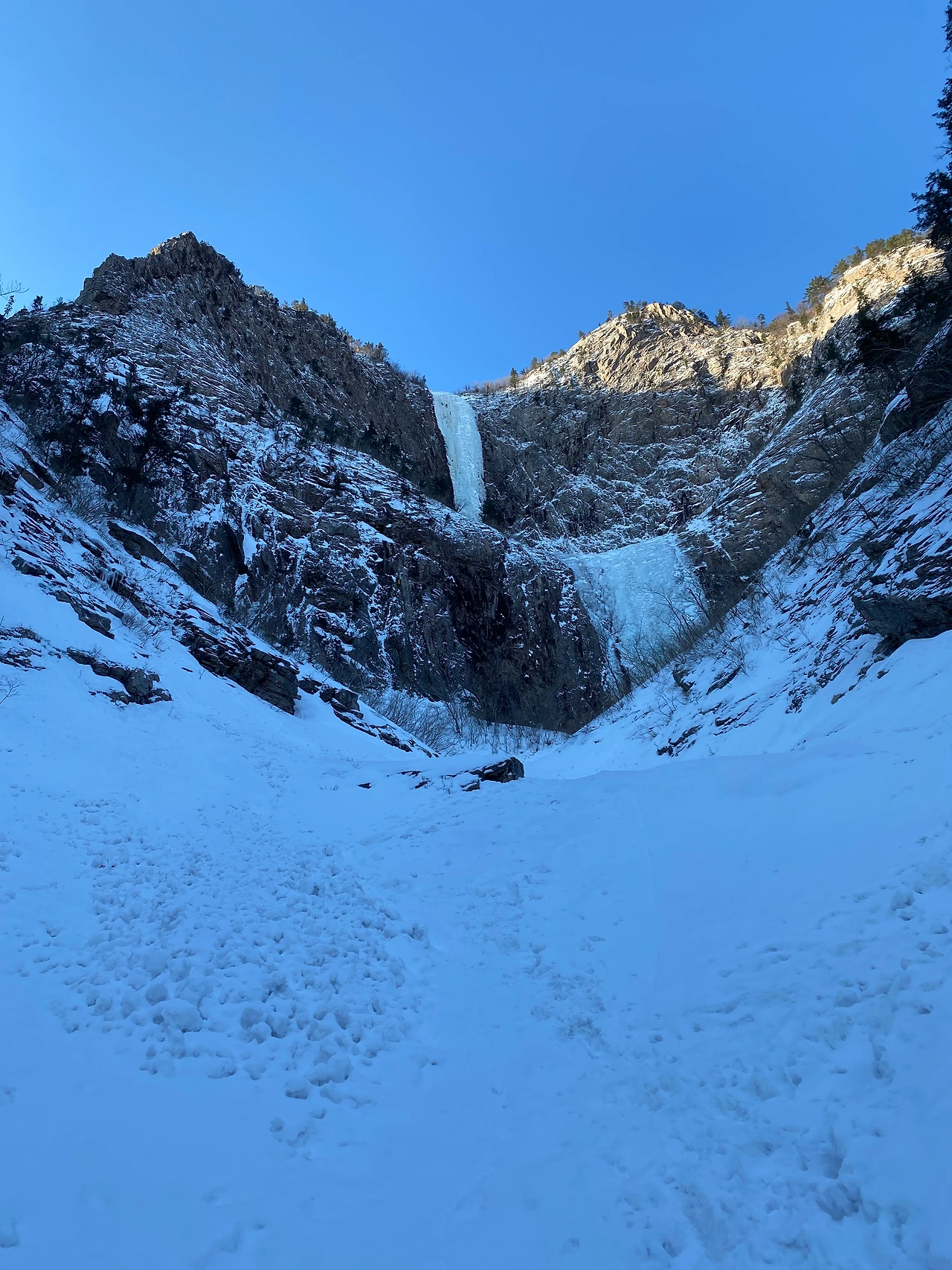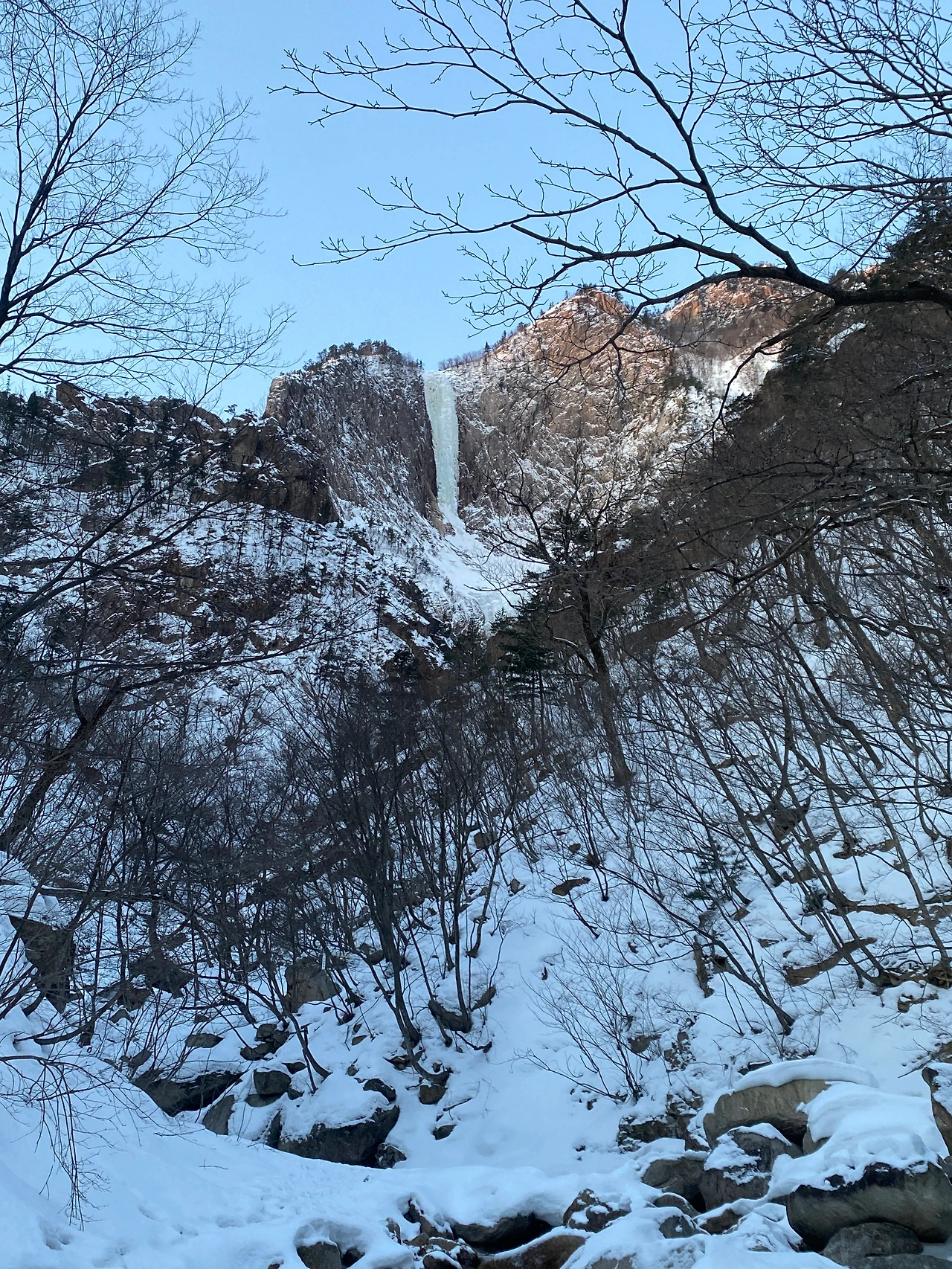 하지만 괜한 걱정이었다. 얼어붙은 토왕폭 하단 위로 길이 아주 잘 나 있었다. 평소엔 물이 떨어져내리는 협곡인데 겨울에만 누릴 수 있는 특권이다.