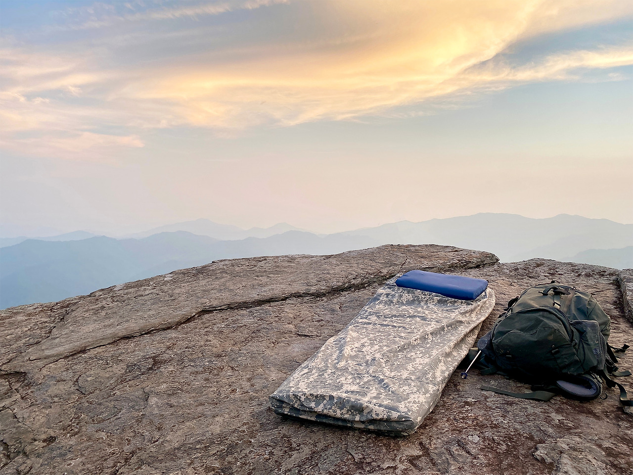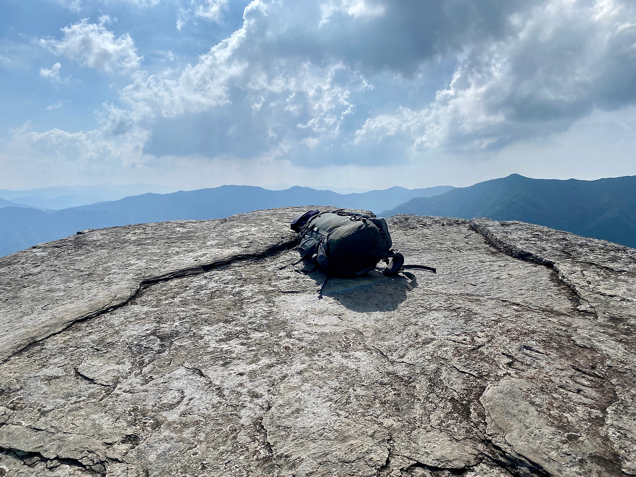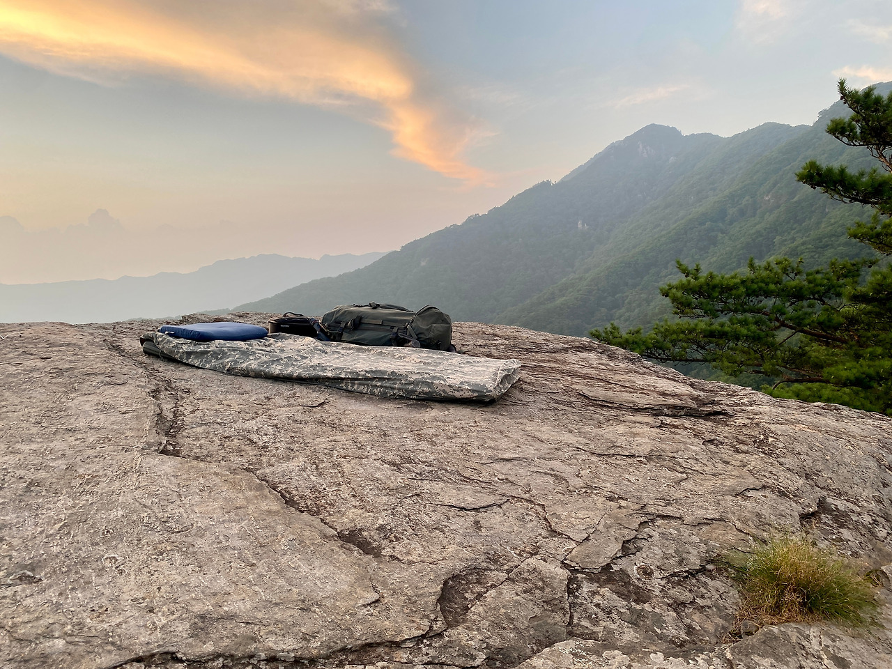 어떤 블로그엔 바위 위가 열 평 정도의 넓은 공간이라고 하던데 그 정도까진 아니고 4~5평 되어 보였다. 10도 정도 기울어진 바위면이라 텐트를 칠 수는 없다. 텐트를 올려놓을 순 있겠지만 슬슬 미끄러져 내려갔다가는 자는 사이에 절벽으로 떨어진다.
