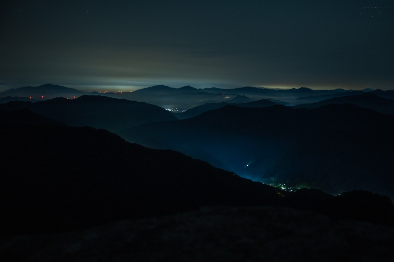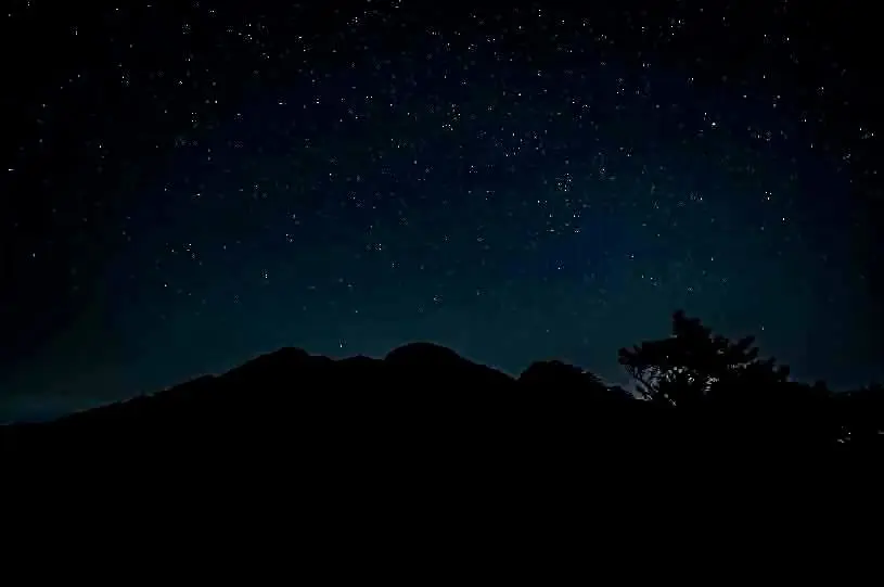 우선 아까까지의 환한 달이 사라지고 주위가 칠흑같이 깜깜했다. 새벽 1시 정도에 달이 진다고 했는데 그 시간이 지났나보다. 달빛에 푸르스름하던 하늘빛이 이제 검은색에 가까웠다. 들떠 보이던 산 사면도 안정된 검은색으로 변해 있었다.