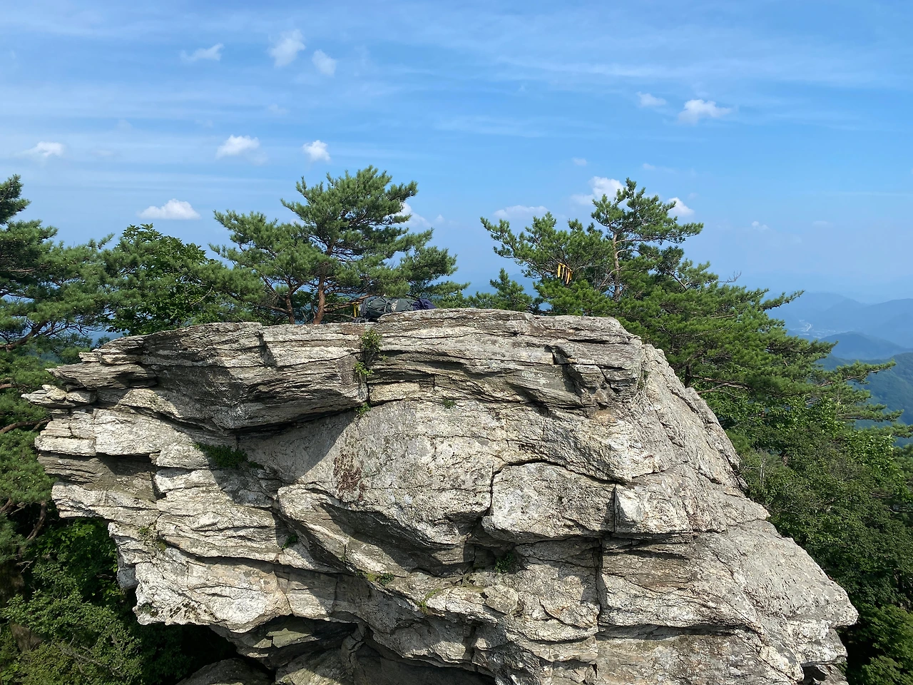 두 시간 반 정도 걸려 신선바위봉(1,089m)에 도착했다. 이 코스는 백덕산 정상(1,350m)까지 고도 천 미터 가까이를 올라야 하는지라 박배낭을 메고 그다지 만만한 코스는 아니다. 마을이 해발 450m 정도 되니 이제 고도차 600미터를 올라온 셈이다.