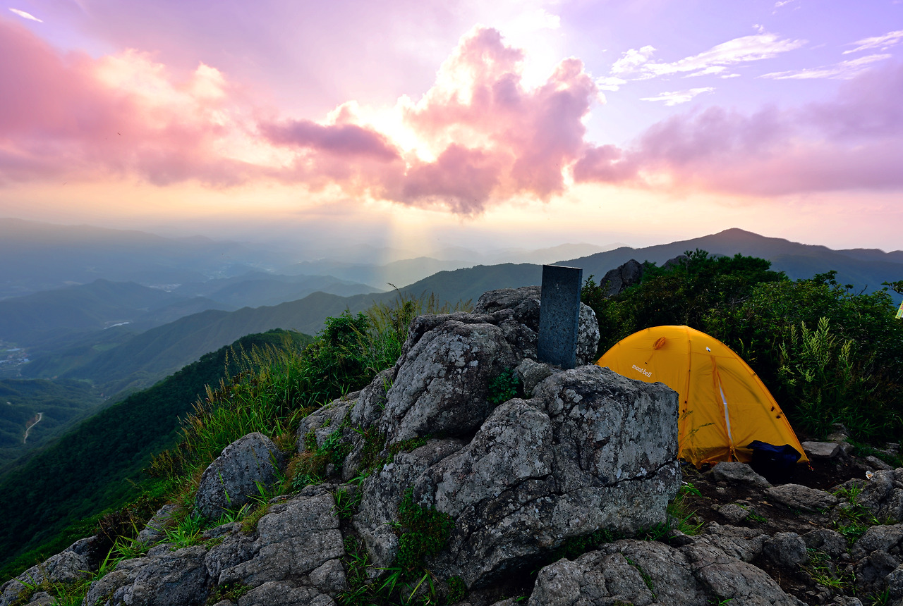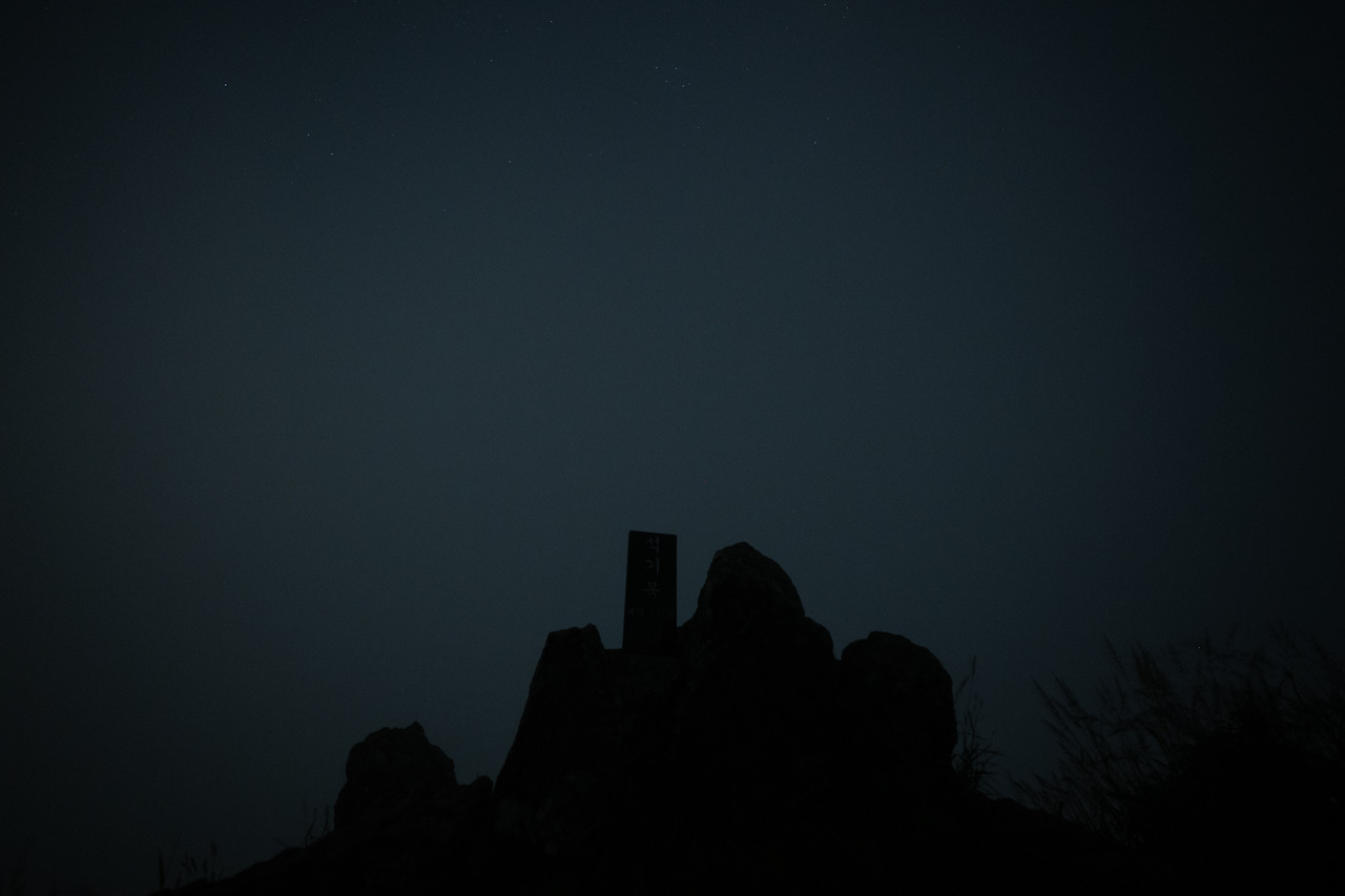 너무 신기해서 밖으로 나갔다. 달도 별도 없는 깜깜한 밤, 산봉우리가 온통 운무에 휩싸여 허얬다. 시커멓고 껌껌한데 허옇다고 하면 말이 되는지 몰라도, 시계는 불과 15미터 정도? 텐트 바로 옆 정상 표지석만 보일 뿐 그 뒤는 그냥 어두운 평면이었다. 불꺼진 극장 스크린 같다고 할까. 어두운 산도, 별도, 밤하늘도, 밤하늘의 구름도, 마을의 불빛도, 아무것도 없었다.