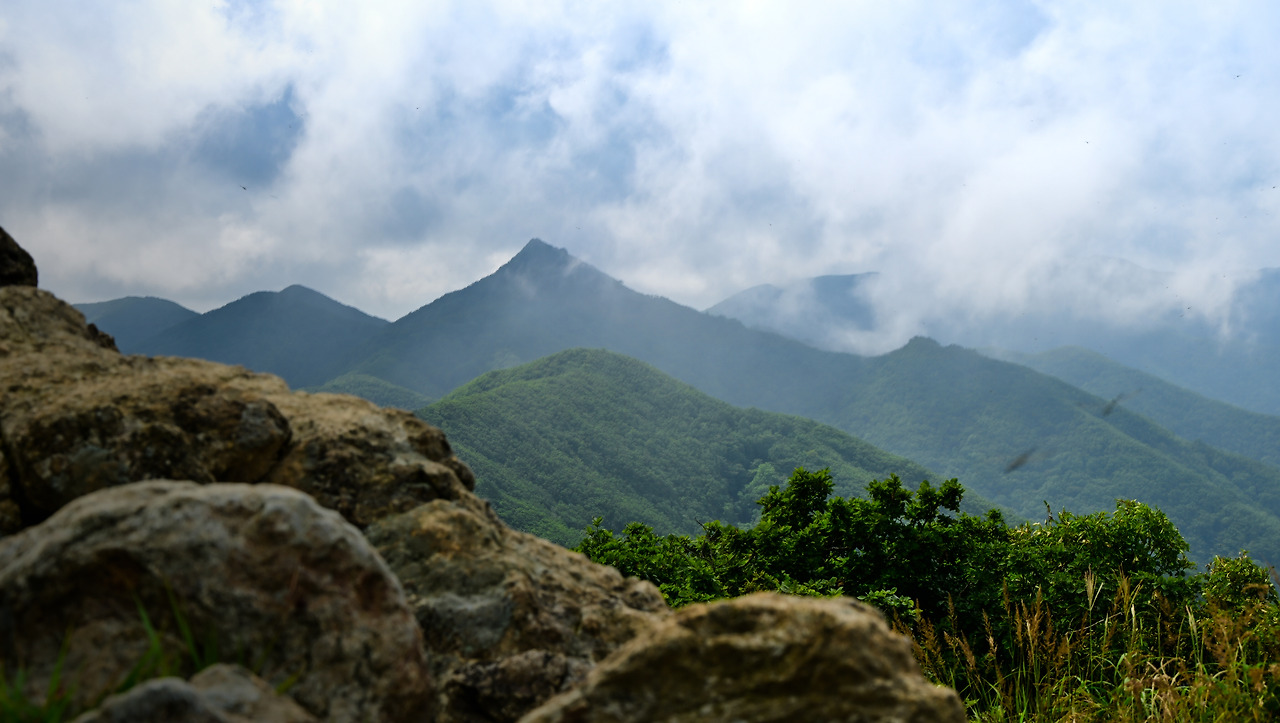 민주지산 정상께에서 바라보는 석기봉(가운데 뾰족한 봉우리). 저 멋진 봉우리에서 하루밤을 보내고 왔다고 생각하니 새삼 뿌듯했다.