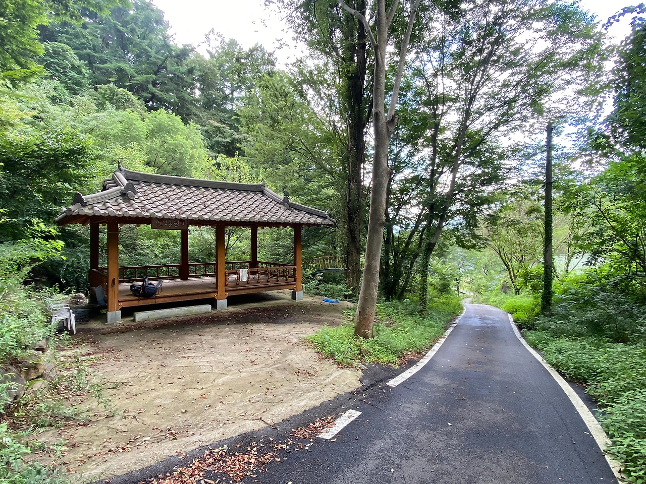 오가는 차 없는 조용한 산촌 도로가 한동안 계속되더니, 마을 입구에서 좌회전하자 차 한 대 겨우 지나갈 좁은 도로가 계곡 상류까지 2km 넘게 이어진다. 계곡 끝에 절과 몇몇 민가들이 있는데 산골도 그런 산골이 없다. 궁금해서 지도로 찍어보니 가장 가까운 가게까지 8km 정도. 이런 데 살면 배달음식도 못 시켜먹고 좀 건강해지려나? 대단한 결심이나 사연이 아니고선 여기까지 와서 집 짓고 살자고 결정하기 쉽지 않을 것 같다.