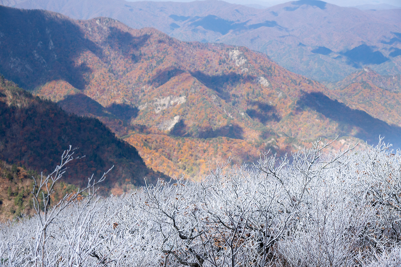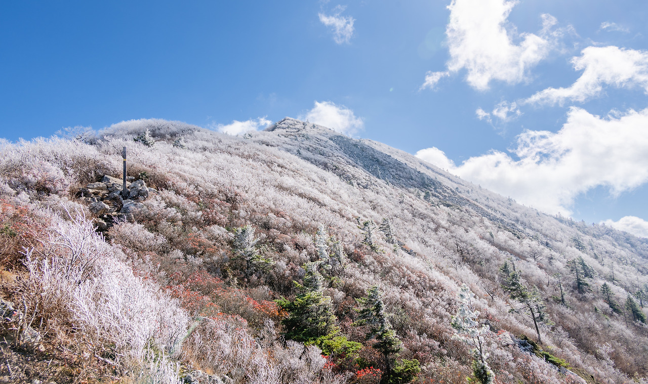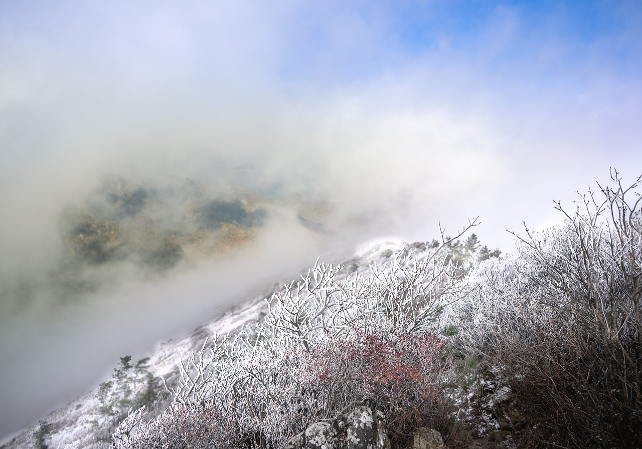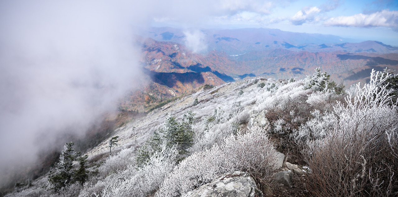 하얀 눈 뒤집어쓴 산정의 앙상한 나무들은, 아직 단풍물 간직한 어여쁜 저 아래 나무들을 내려다보며 무슨 생각이 들었을까?