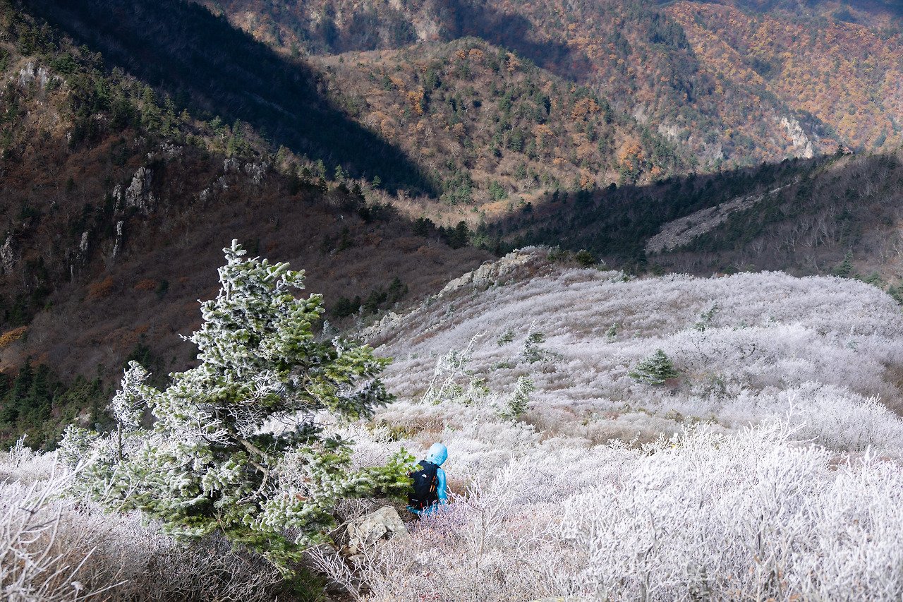 귀때기청 안부, 하얀 세상과 초록 세상의 경계에 잠시 앉아 쉬었다. 그리고 따스하게 느껴지기 시작하는 햇살 아래, 우리는 바람 몰아치는 하얀 봉우리에서 단풍 알록달록한 계곡으로, 겨울에서 가을로, 천상에서 속세로, 걸어 내려가기 시작했다.
