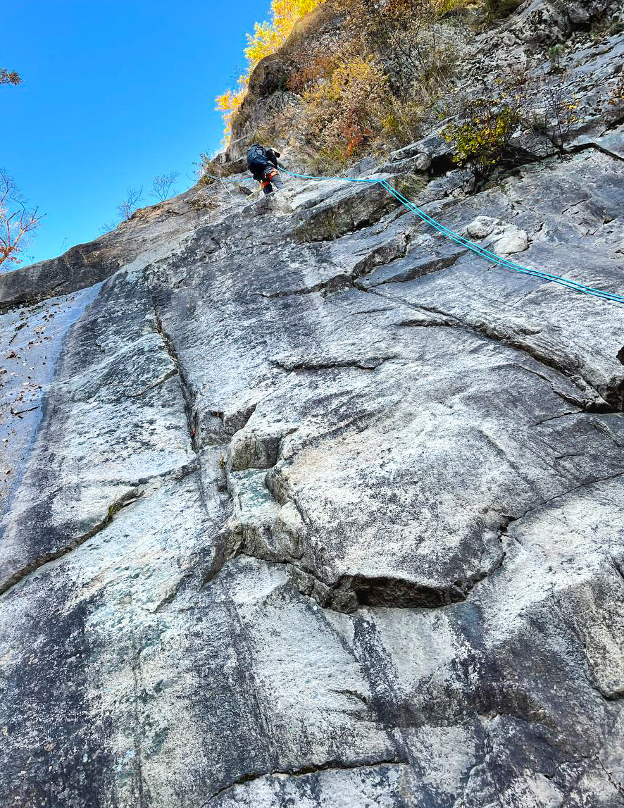 위 사진은 내려오는 방향 만나는 두번째 폭포(제1폭포). 우회로가 있다는데 찾지를 못했고 어차피 자일을 준비했었기에 그냥 하강했다. 역시 상단에 쌍볼트가 설치되어 있고, 하강 길이는 30미터 살짝 못 미친다. 60미터 로프가 아주 조금 남았다. 중단에 확보용 볼트가 두 개 있다(더 있는데 못 보았을 수도).