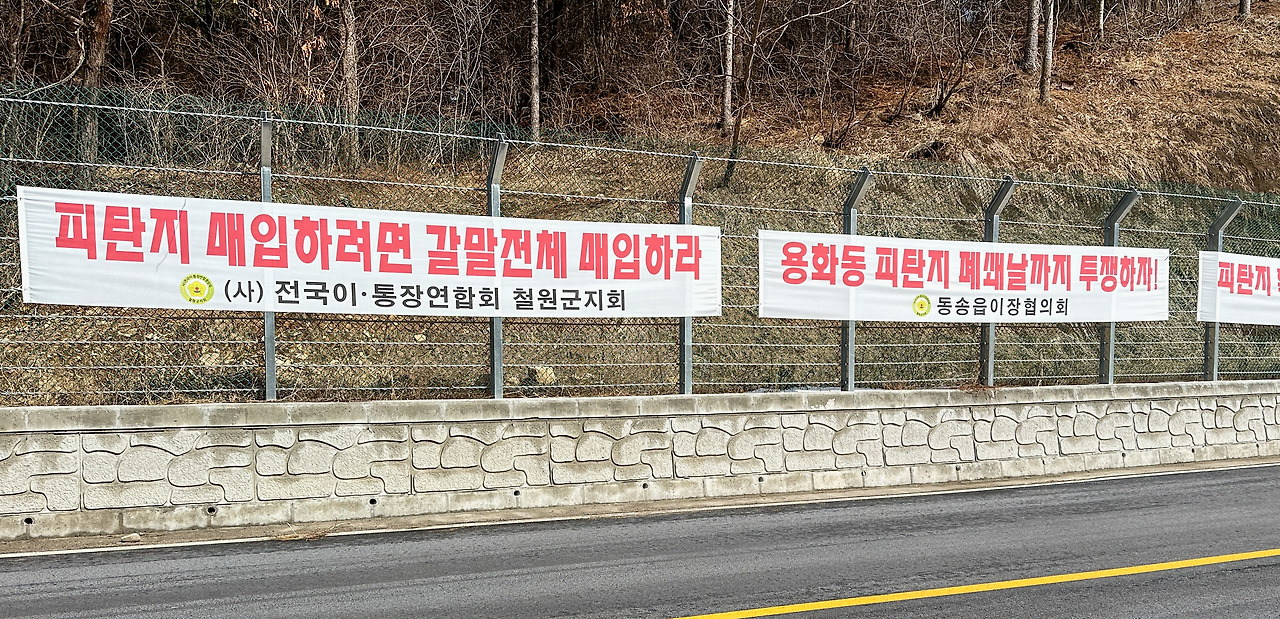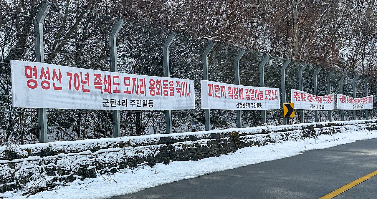 웅장한 산세 아래 위치한 마을, 입구엔 현수막이 늘어서 있다.