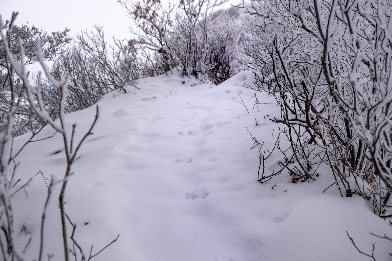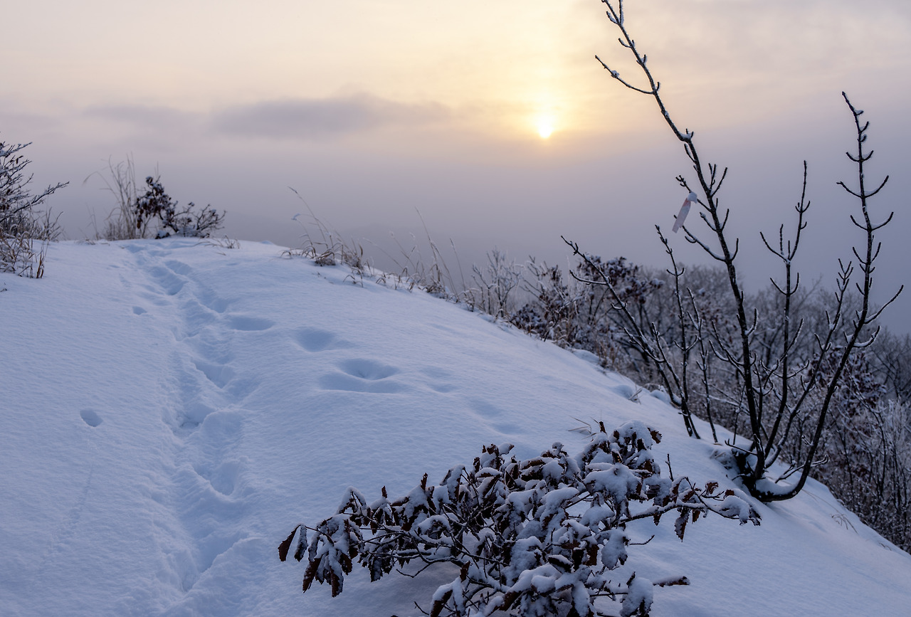 산에 아직 눈이 쌓여 있는 것은 물론이고 산길에 발자국도 없어 얕은 러셀(?)하며 온 것만으로도 감사할 일인데, 선물 같은 눈까지 내리다니.