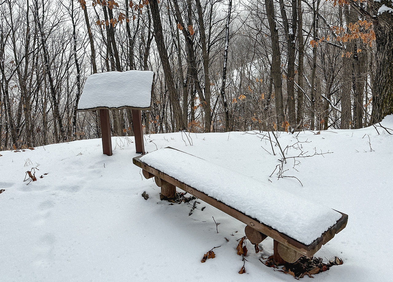 산비탈을 거의 내려와 계곡이 가까워지자 악보대 같이 생긴 것이 눈에 덮여 있다. 안 그래도 조금 전의 햇살과 조망으로 가슴이 벅찬 느낌인데, 저 앞에 서서 오케스트라를 지휘해야 할 것 같다.
