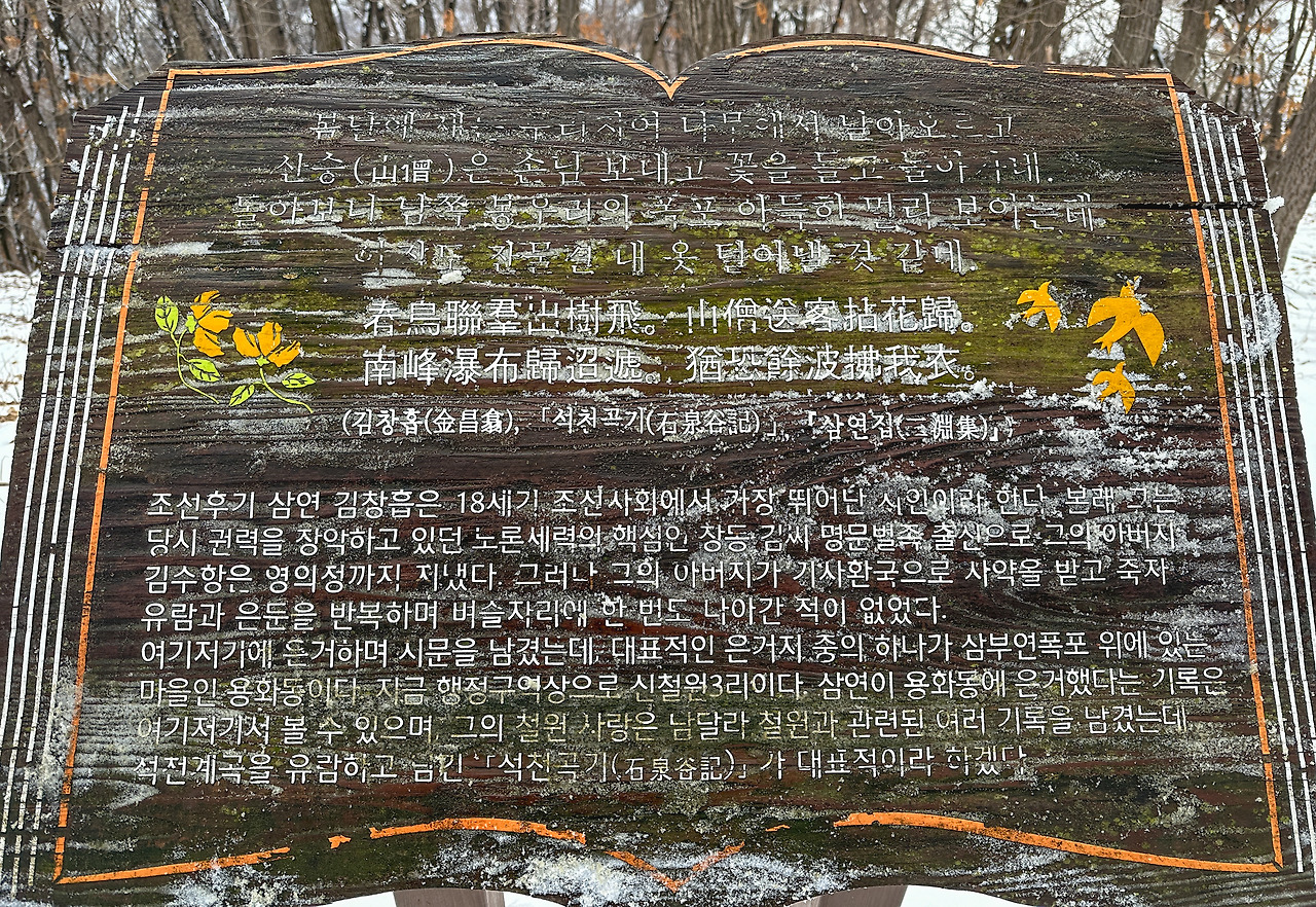 눈 아래엔 무슨 내용이 적혀 있을까? 설마 악보는 아닐테고, 등산 지도? 명성산 역사 안내?