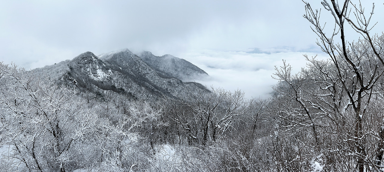 어제까지만 해도 겨울이 이미 다 가버렸으면 어떡하나 걱정하던 것이 무색하게, 엄한 흑백의 겨울산이 서 있다.