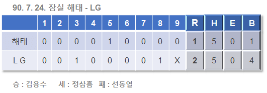 그렇게 맞은 7월 24일 해태와의 잠실 3연전 첫경기. 해태는 신동수, LG는 김용수가 선발로 나왔다. 5위에 처져 있는 해태는 시급한 반등이 절실했고, 충격의 4연패를 당한 LG도 반드시 1승이 필요했다.