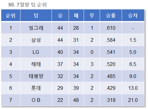 LG 대 해태전은 한국프로야구 최고의 흥행카드로, 수많은 관중이 자아내는 긴장감 때문인지는 몰라도 늘 박빙의 승부가 이어졌다. 경기 내용도 양팀의 호수비가 이어지고 긴박한 투수전이 전개되는 등 수준이 높았다. 그래도 LG 입장에서는 선동열 조계현 이강철 등 몇몇 투수만 공략하면 그나마 해볼만 하다는 느낌이 있었고 실제로 90년 양팀 전적도 호각세를 이루었다. 그와는 반대로 젊은 선수들이 펄펄 나는 빙그레에게는 속수무책이었다. 전년도인 ‘89 시즌에도 MBC 청룡의 대 빙그레 성적은 3승 1무 15패였다. 빙그레의 페넌트레이스 1위를 만들어준 결정적 도우미가 바로 청룡이었다.