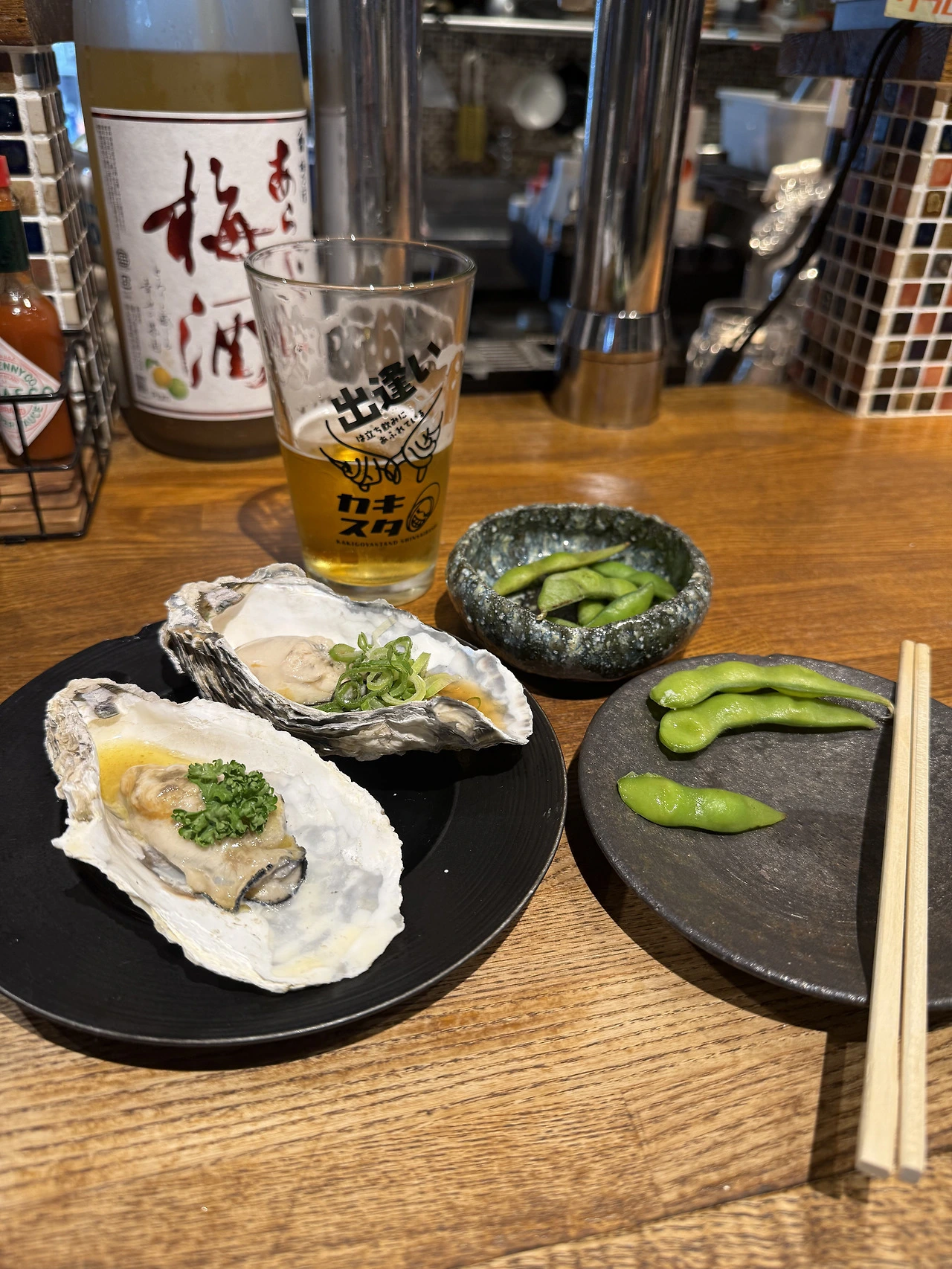 호텔까지 10분 정도 남았을 때, 사람이 적은 이자카야를 발견했다. 나는 그대로 들어가 굴과 생맥주를 주문했다. 사진 속의 굴은 엔초비와 버터 소스, 쯔유 소스에 절여진 굴이다. 비록 사진을 남기진 못했지만, 레몬과 고수, 소금으로 베이스를 한 굴도 먹었다. 레몬과 고수의 조합이 생각보다 찰떡이었다. 하루를 돌아보며 맥주를 들이켜니 안주와 술이 금세 바닥났다. 추가로 주문하기엔 애매했다. 그렇게 나는 20분 만에 가게를 떠났다.