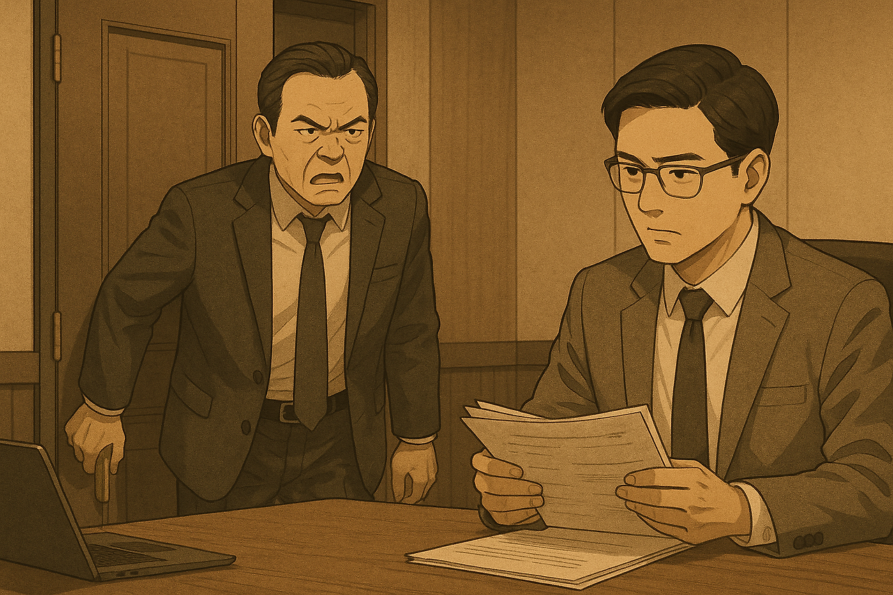 평소 다혈질이고 막말을 많이 하는 이성기 사장은 회색 정장을 입고 신경질적으로 문을 열며 회의실로 들어왔다. 직원들은 그의 갑작스러운 호출에 경직된 분위기로 그를 맞았다.