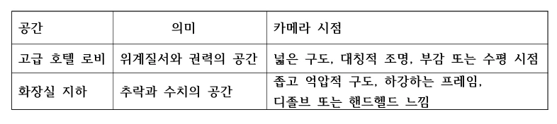 밝은 호텔 로비 ↔ 어두운 지하 화장실의 대조 → 계급과 자존감의 시각적 상징화