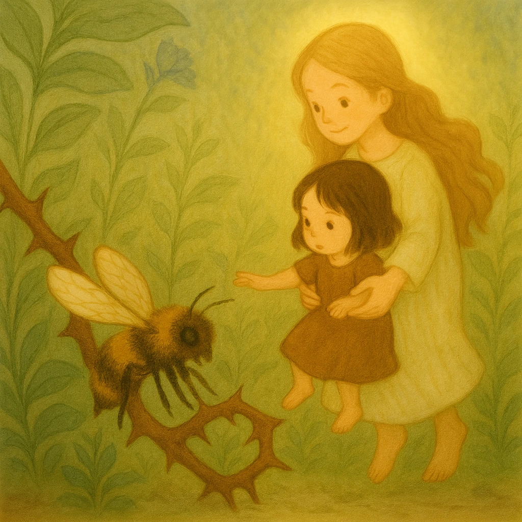 마렌이 작은 나를 안아서 나뭇가지에 올려주었고, 나는 가시를 밀어내고 벌의 다리를 조심스레 풀어줬어.