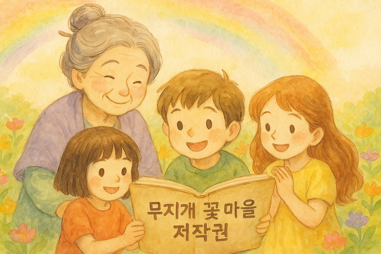 지혜 할머니가 미소를 지으며 커다란 책 한 권을 꺼냈어요. “이건 ‘무지개 꽃 마을 저작권’이라는 마법의 책이란다.
