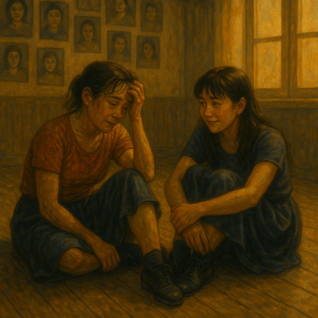 연습이 끝난 후, 두 사람은 헐떡이며 바닥에 주저앉았다. 땀에 젖은 얼굴을 닦으며 서로를 바라보았다.
