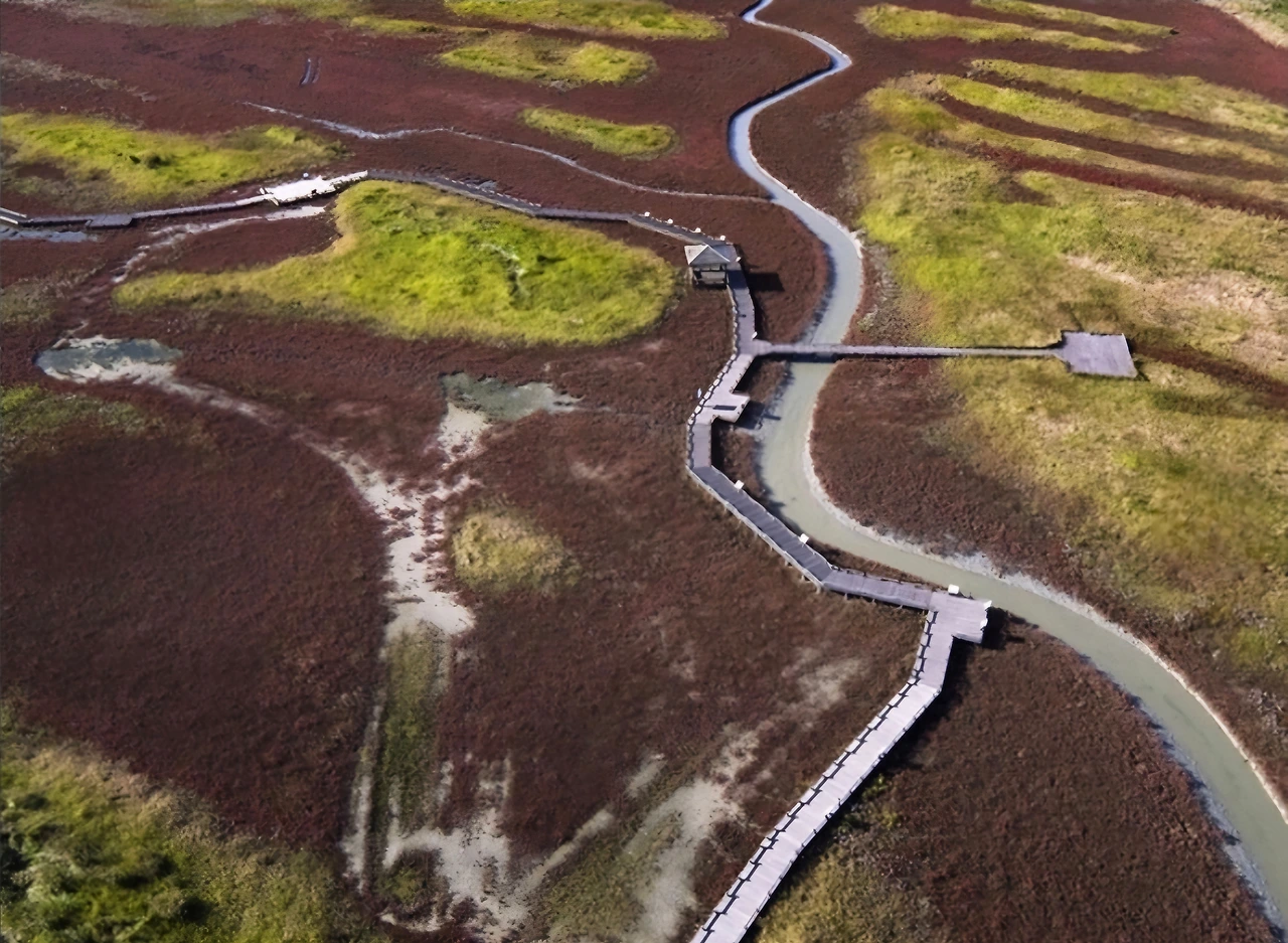 지형: 평탄한 염전 지대와 낮은 구릉 / 다리로 연결된 섬