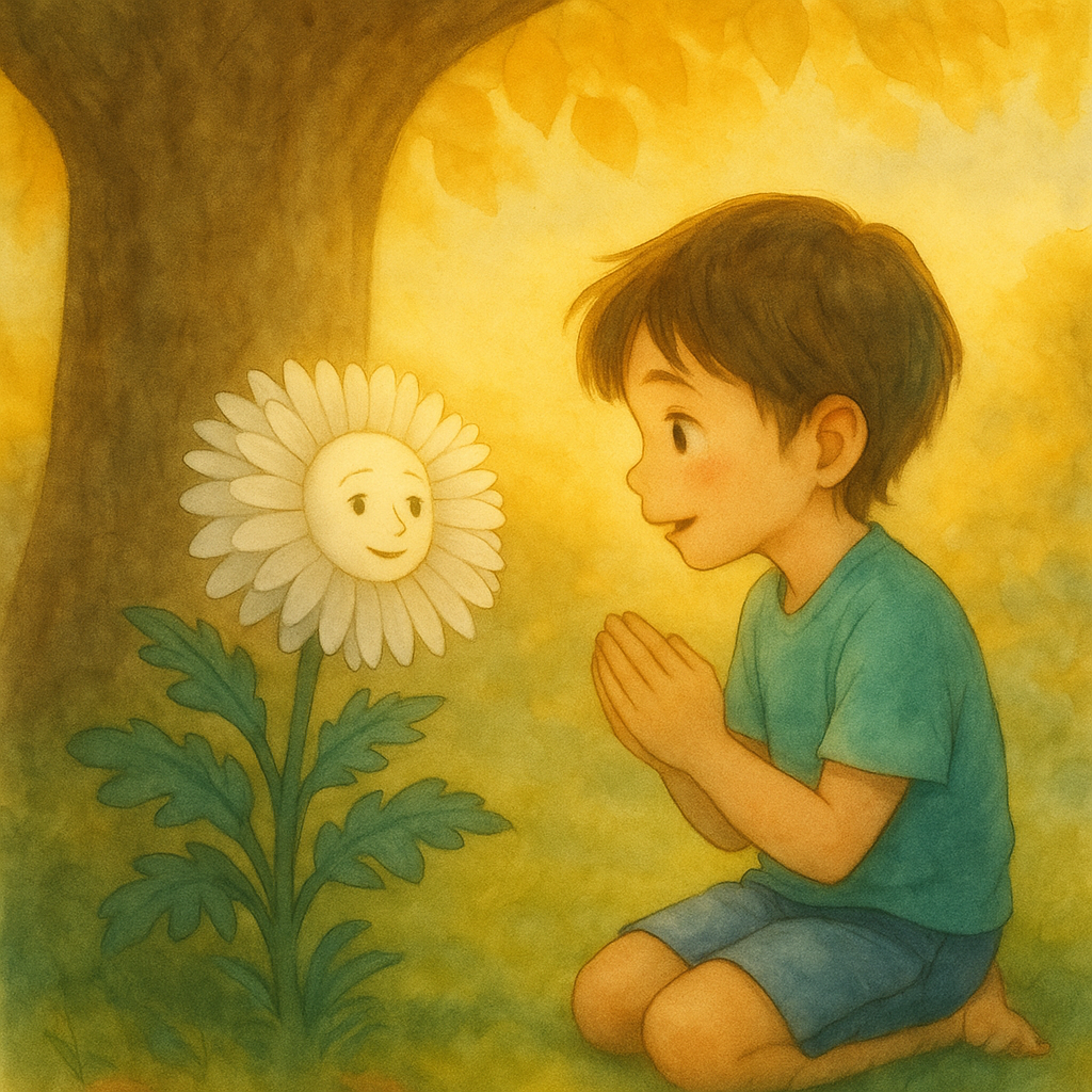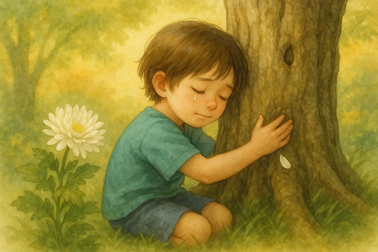 대신, 나무 아래에서 흰 국화 한 송이가 흔들리고 있었어.
