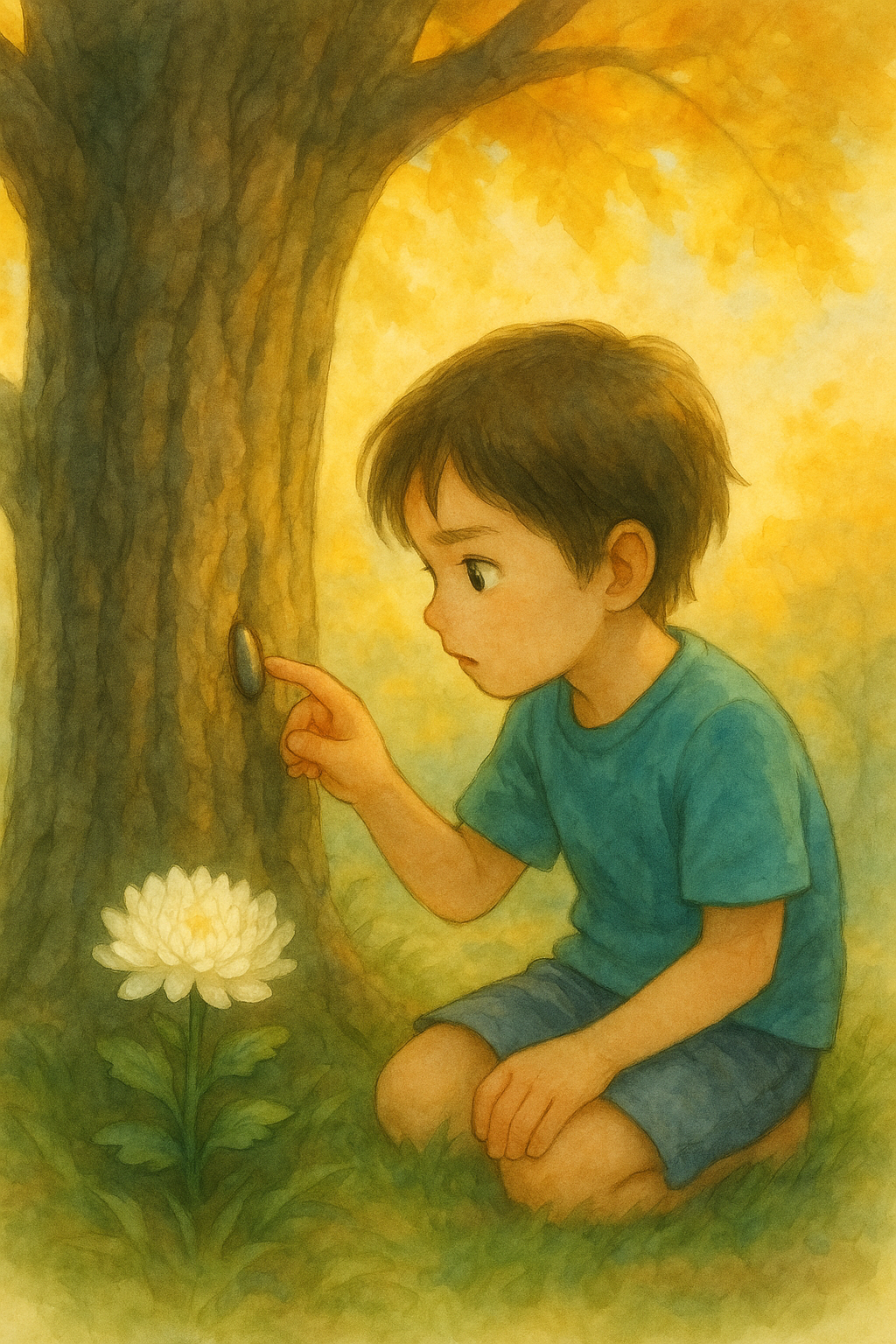 소년 재윤은 마당에 서 있는 오래된 나무 아래에서 놀고 있었지.