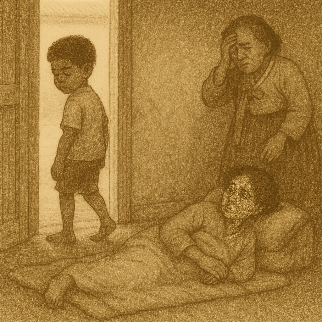 방 밖에서는 작은 새들이 지저귀고 있었지만, 철이 집안의 분위기는 무겁고 어두웠다. 할머니의 원망 섞인 말투, 엄마의 지친 한숨, 그리고 철이의 무표정한 얼굴이 어우러져 그곳에는 더 이상 희망이 남아 있지 않은 듯했다. 철이는 그렇게 하루하루를 버텨내고 있었다.