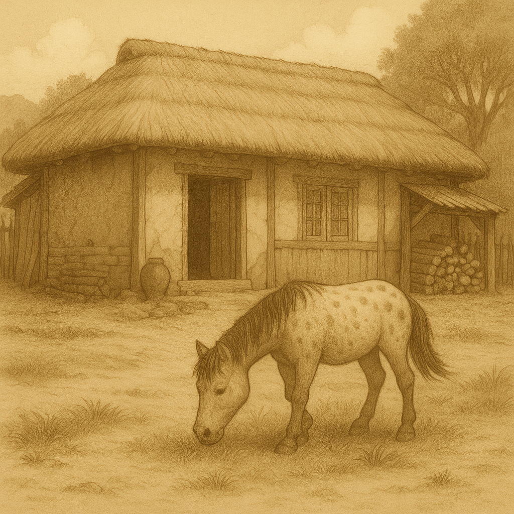 철이는 말을 끌고 마당을 지나 천천히 길을 따라 걸었다. 그가 지나는 길목마다 꽃들이 피어 고왔지만, 철이의 마음은 어두운 구름에 가려져 있었다.
